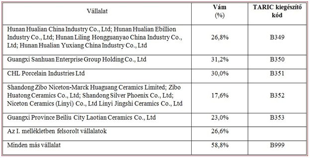 "(1) A jelenleg az ex 6911 10 00, ex 6912 00 10, ex 6912 00 30, ex 6912 00 50 és ex 6912 00 90 KN-kód alá tartozó (TARIC-kódok: 6911 10 00 90, 6912 00 10 11, 6912 00 10 91, 6912 00 30 10, 6912 00 50 10 és 6912 00 90 10), a Kínai Népköztársaságból származó, asztali és konyhai kerámiaáruk - kivéve a kerámiakéseket - behozatalára ideiglenes dömpingellenes vám kerül kivetésre.