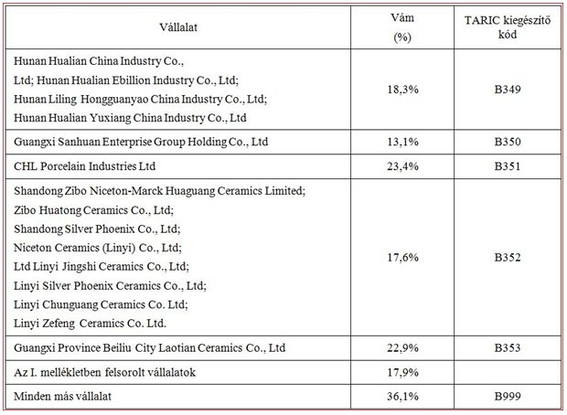 3. A Kínai Népköztársaságból származó egyes asztali és konyhai kerámiaáruk behozatalára vonatkozó ideiglenes dömpingellenes vám kivetéséről szóló, 2012. november 14-i 1072/2012/EU bizottsági rendelet (HL 2012. L 318., 28. o.; helyesbítés HL 2013. L 36., 11. o.) 1. cikke ekképp rendelkezik: