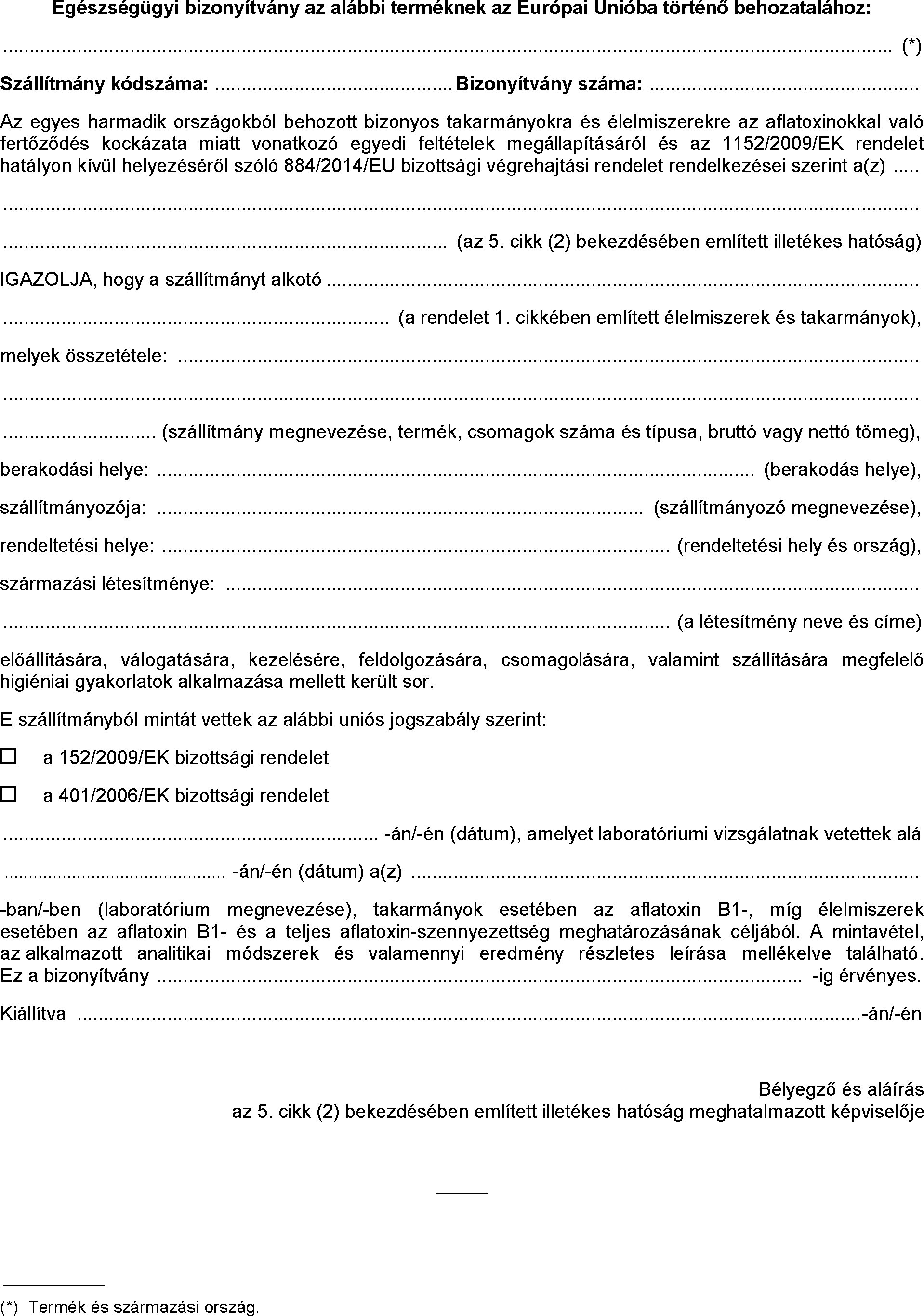 A Bizottság 884/2014/EU végrehajtási rendelete ( 2014. augusztus 13. ) az egyes harmadik országokból behozott bizonyos takarmányokra és élelmiszerekre az aflatoxinokkal való fertőződés kockázata miatt vonatkozó egyedi feltételek megállapításáról és az 1152/2009/EK rendelet hatályon kívül helyezéséről