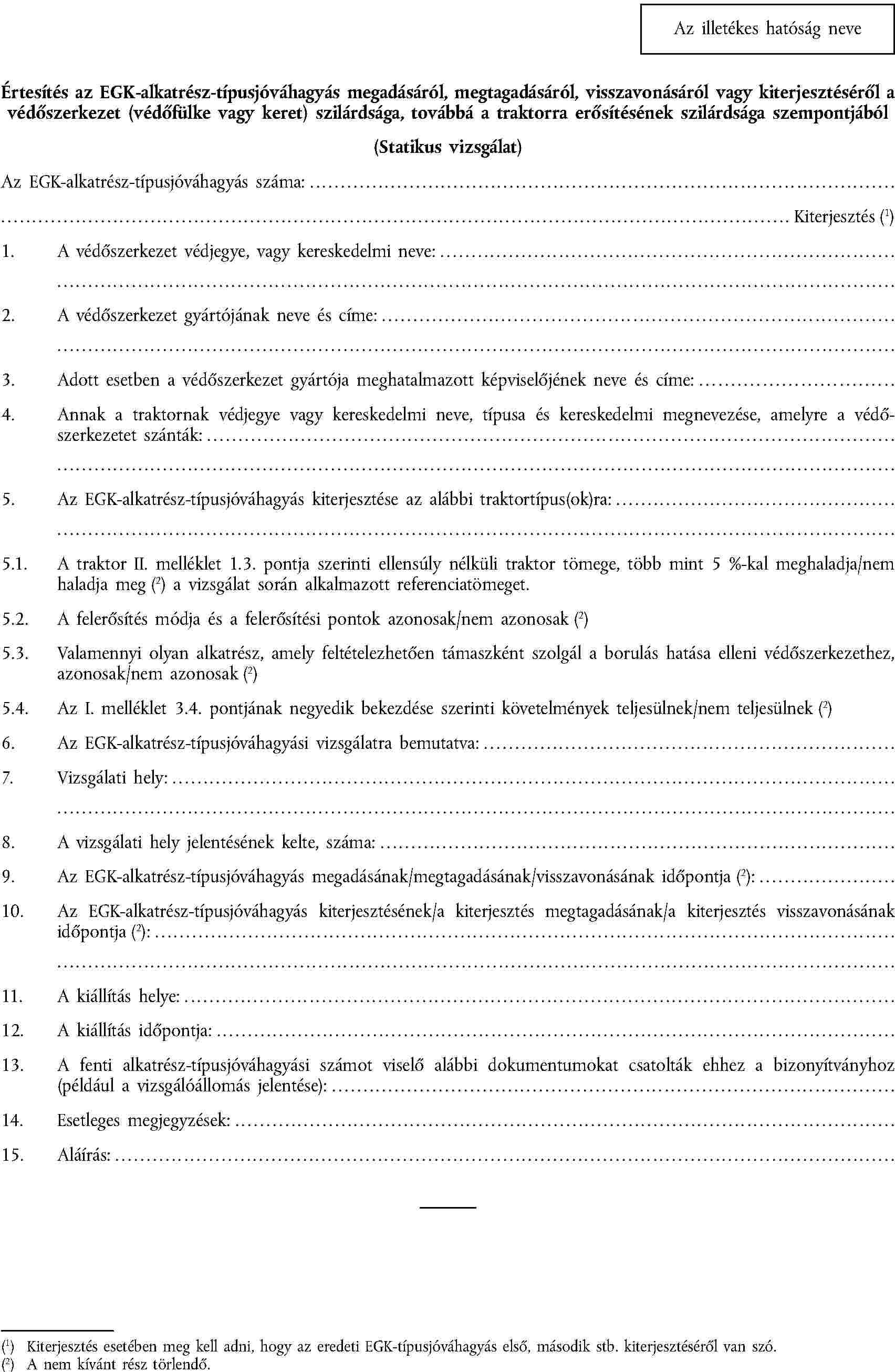 1. A traktor gyártója vagy meghatalmazott képviselője kérelmezi a traktor EGK-típusjóváhagyását a védőszerkezet szilárdsága és a traktorra erősítésének szilárdsága tekintetében.