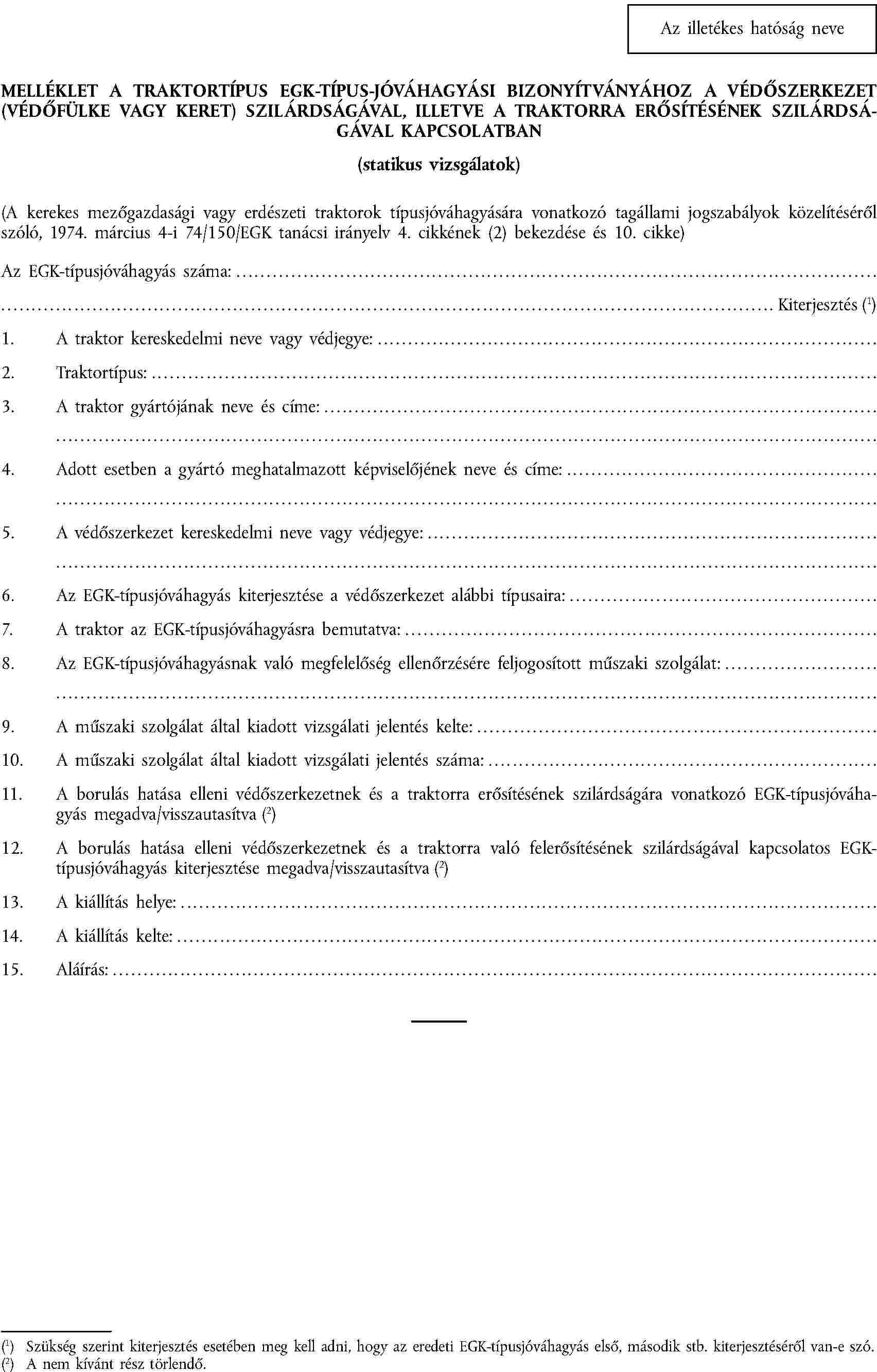 IX.melléklet: | Melléklet az egyes traktortípusok EGK-típusjóváhagyási bizonyítványhoz a borulás hatásai elleni védőszerkezetek szilárdsága és a traktorokra erősítésének szilárdságával kapcsolatban. |