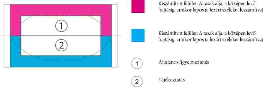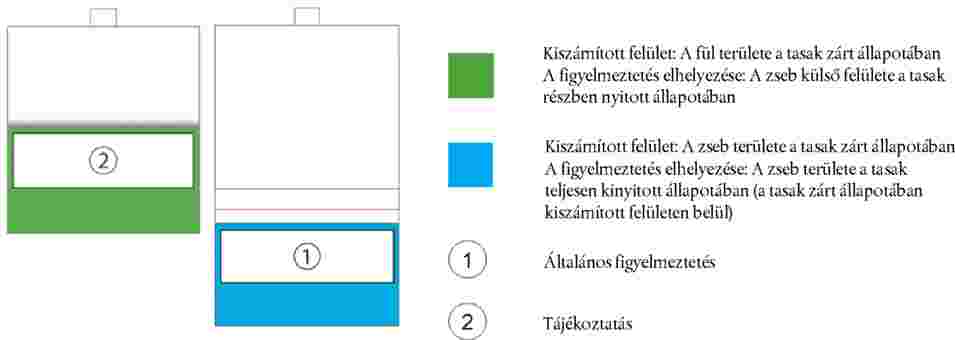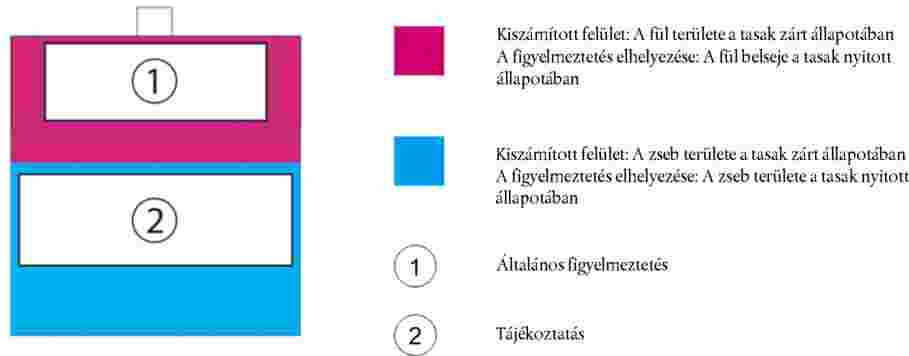 (2) Az általános figyelmeztetést a csomagolási egység alján levő hajtás feletti felületre, a tájékoztatást pedig a hajtás alatti felületre kell nyomtatni. Az általános figyelmeztetésnek és a tájékoztatásnak ki kell töltenie annak a felületetnek az 50 %-át, amelyre azt nyomtatták. A felületeket a szélek lezárása utáni méreteiket használva kell kiszámolni.