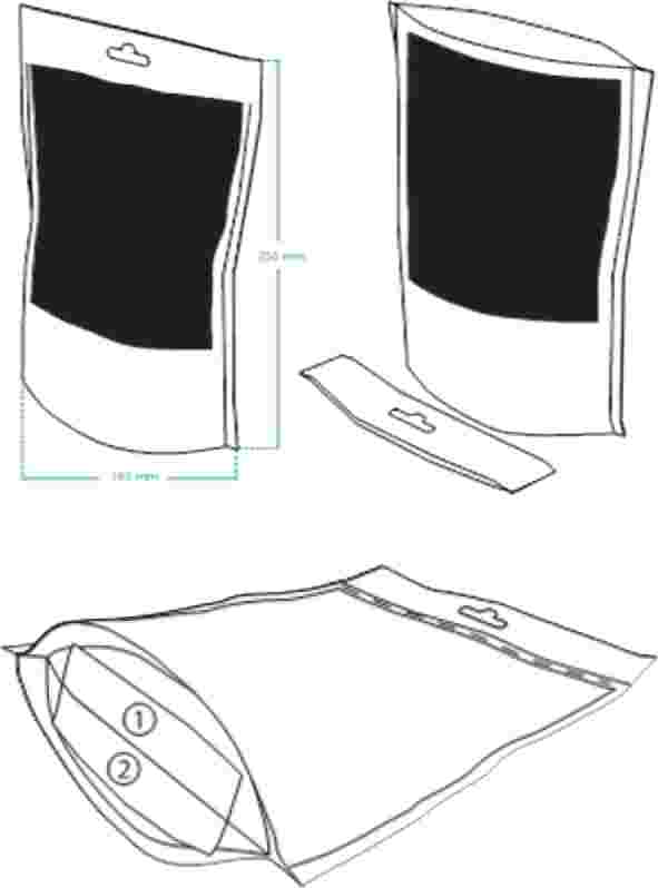 (2) A téglalap alakú tasak vagy körbetekerhető füles tasak, amelyet jellemzően két lépésben lehet kinyitni, vagy ráhajtható füllel ellátott talpas tasak, amelyet jellemzően egy lépésben lehet kinyitni. Ezek a tasakok gyakran átlátszó műanyag fóliából és az ezekbe illesztett papírból állnak; utóbbira nyomtatják rá az egészségvédő figyelmezetést. Egyes esetekben a körbetekerhető füles tasakok polietilénből, polipropilénből vagy laminált anyagból készülnek, amelyeket az ágazat szerint újra kellene tervezni annak érdekében, hogy a fül mindkét oldalára nyomtatni lehessen, különösen akkor, ha a tasak nem többrétegű.