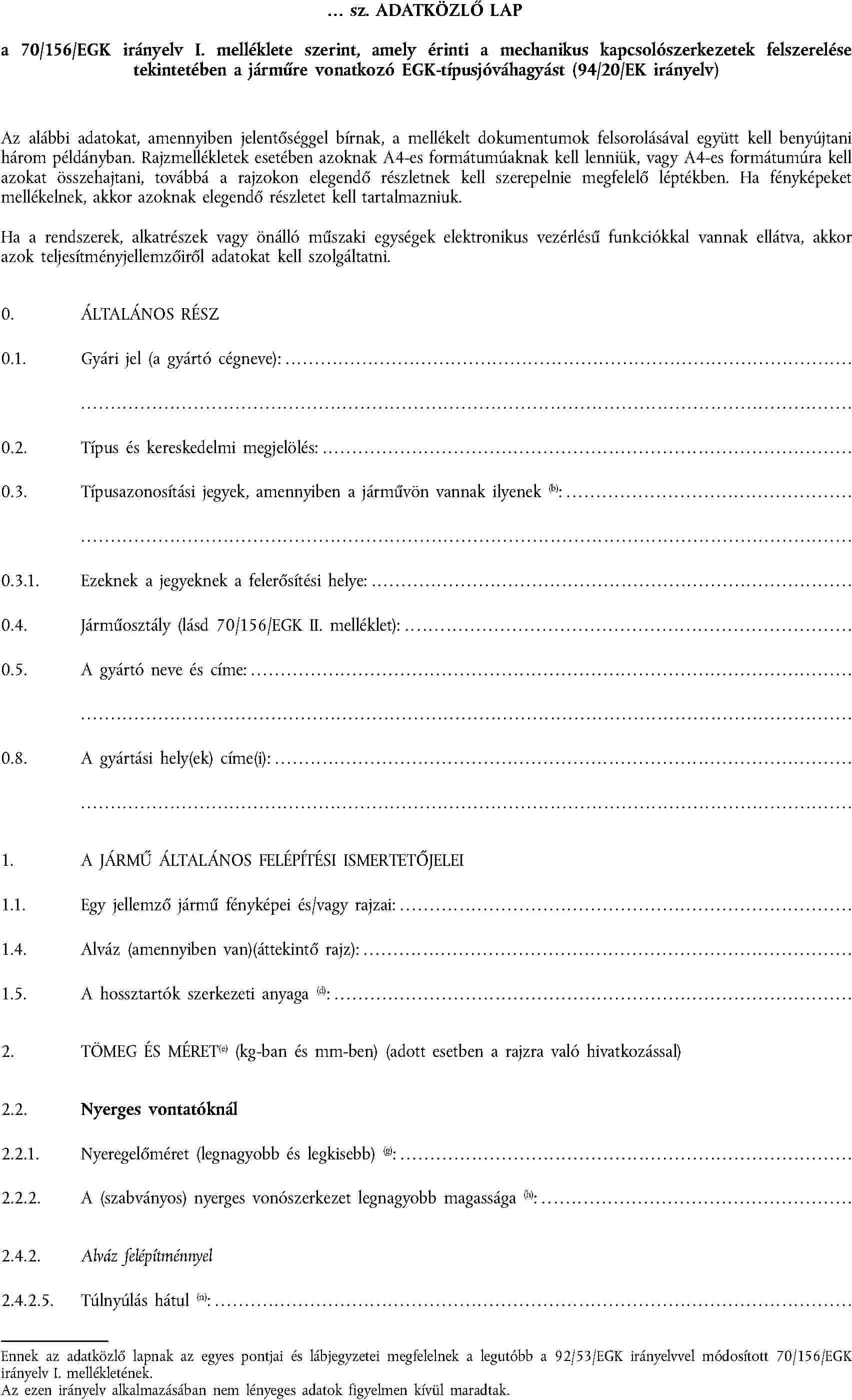 1.1. Ez az irányelv a gépjárművek és pótkocsijaik közötti mechanikus kapcsolószerkezetekre és ezeknek a szerkezeteknek az 1. cikkben leírt közúti járművekre való felszerelésére érvényes.
