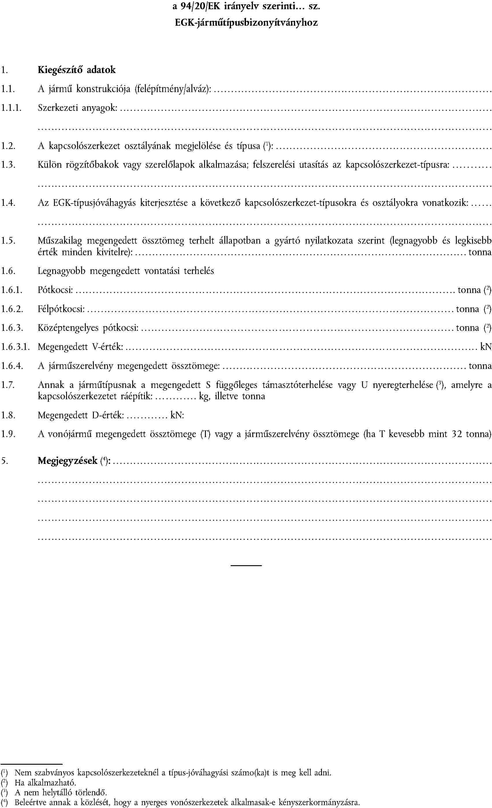 1.4. A B, D, E és H osztályú kapcsolószerkezeteknek a pótkocsira szerelésénél elvileg 32 tonnás értéket kell figyelembe venni a vonó jármű T össztömegeként a D-érték számításához. Ha a kapcsolószerkezet D-értéke nem elegendő T = 32 tonnához, akkor az ebből adódó korlátozást a vonó jármű T tömege, illetve az összetett közúti jármű (szerelvény) tömege tekintetében fel kell tüntetni a pótkocsi engedélylapján (IX. melléklet).
