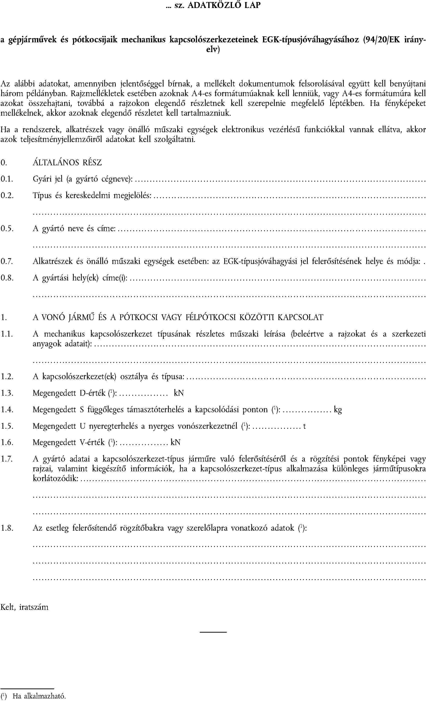 III. MELLÉKLET | A mechanikus kapcsolószerkezetek EGK-típusjóváhagyására vonatkozó adatközlő lap |