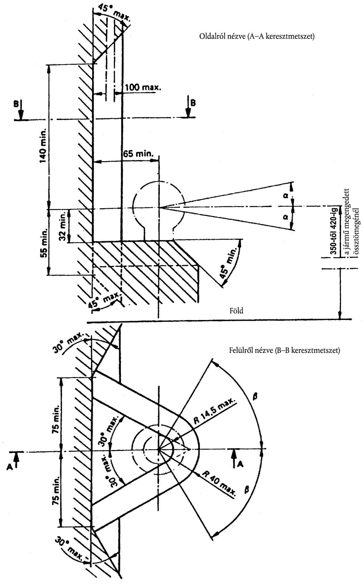 Ha az alkalmazott kapcsoló megjelölése szabványos csapos vonószerkezet-típusra vonatkozik, akkor a 32. ábrán és a 8. táblázatban feltüntetett csatlakozóméreteket be kell tartani a járműnél.