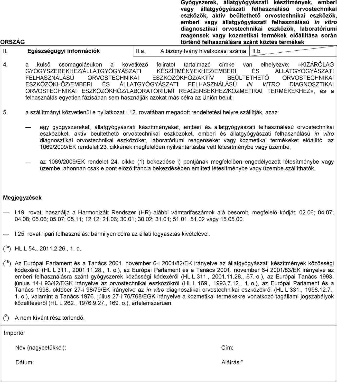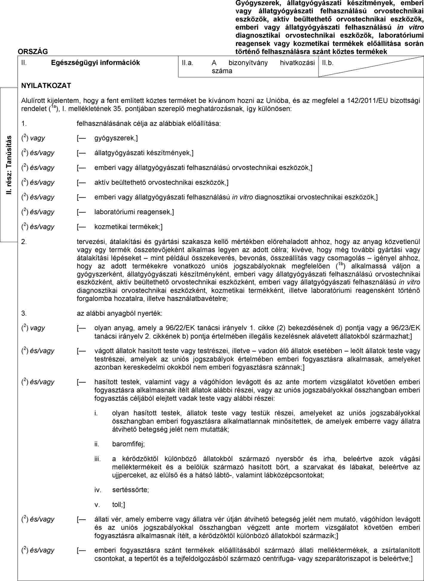 Nyilatkozat a gyógyszerek, állatgyógyászati készítmények, emberi vagy állatgyógyászati felhasználású orvostechnikai eszközök, aktív beültethető orvostechnikai eszközök, emberi vagy állatgyógyászati felhasználású in vitro diagnosztikai orvostechnikai eszközök, laboratóriumi reagensek vagy kozmetikai termékek előállítása során történő felhasználásra szánt köztes termékek harmadik országból történő behozatalához és az Európai Unión átmenő tranzitszállításához