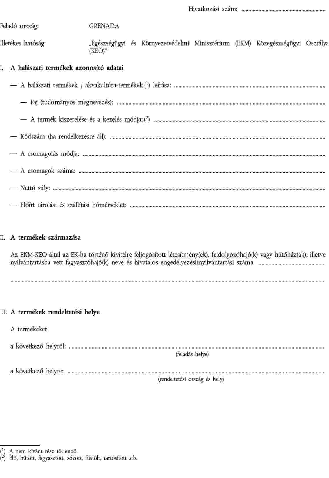 Minden csomagon kitörölhetetlen módon fel kell tüntetni a "GRENADA" szót, valamint a származás szerinti létesítmény, hűtőház, feldolgozóhajó vagy fagyasztóhajó engedélyezési/nyilvántartási számát, kivéve a tartósított élelmiszerek gyártására szánt ömlesztett, fagyasztott halászati termékek esetében.