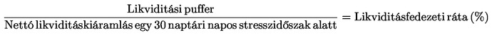 (1) A részletes likviditásfedezeti követelmény az 575/2013/EU rendelet 412. cikkének (1) bekezdésében foglaltaknak megfelelően a hitelintézet likviditási pufferének egy 30 naptári napos stresszidőszak alatti nettó likviditáskiáramlásához viszonyított, százalékban kifejezett aránya. A hitelintézet a likviditásfedezeti rátát az alábbi képletnek megfelelően számítja ki: