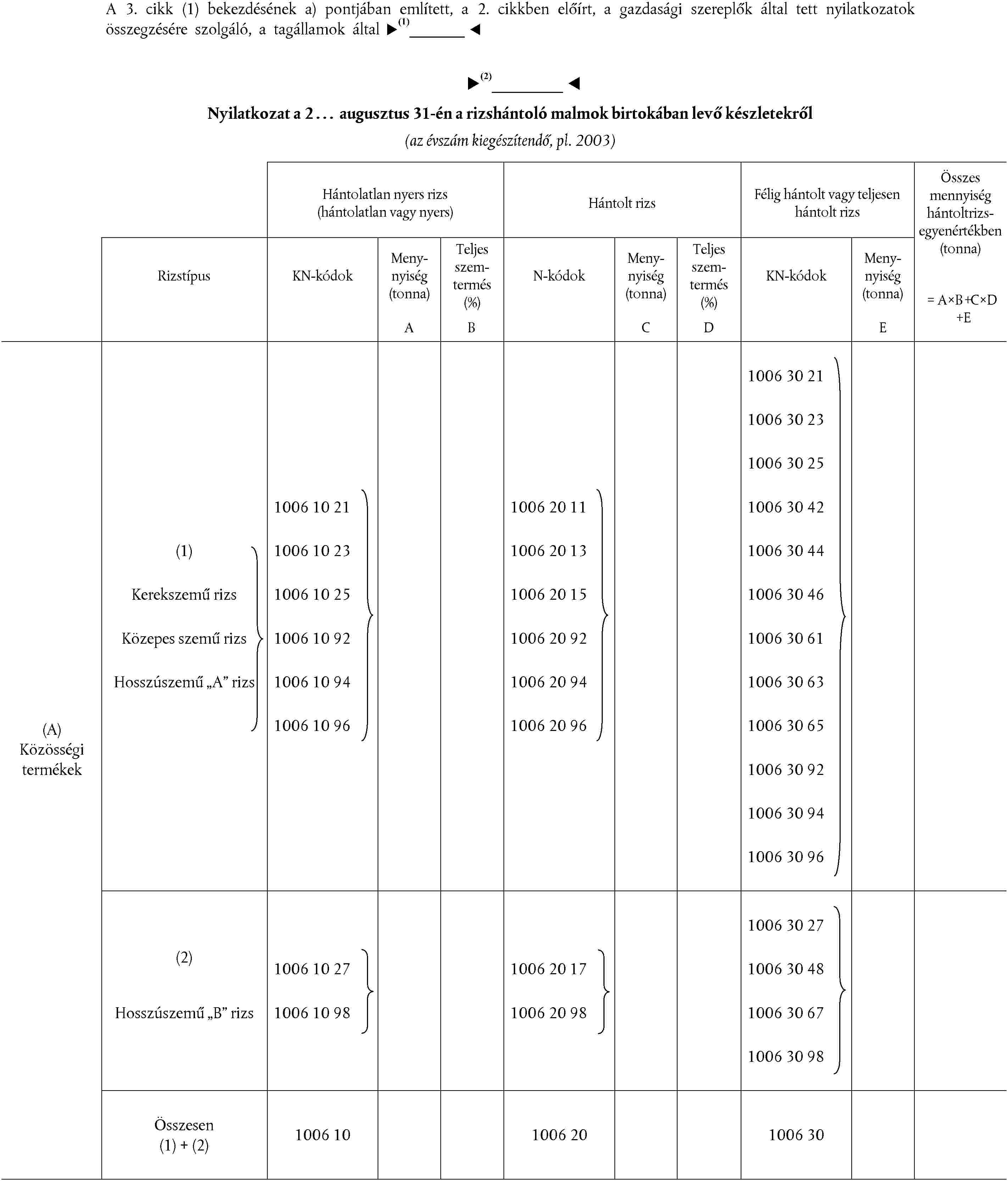 Feldolgozó és behozatali tevékenységükkel kapcsolatosan a rizshántoló malmok minden év október 15. előtt megküldik azon tagállam intervenciós hivatalának, amelyben találhatók, illetve az adott tagállam által kijelölt bármely más szervnek az augusztus 31-én birtokukban levő rizskészletekről szóló nyilatkozatot, megkülönböztetve a 3072/95/EK rendelet A. mellékletének (2) bekezdésében meghatározott rizstípusokat, elkülönítve a Közösségben termelt és a harmadik országokból behozott rizsmennyiségeket. A tulajdonukban levő mennyiségeket feldolgozási szakasz szerinti bontásban tüntetik fel. A hántolatlan nyers rizs (hántolatlan rizs) vagy a hántolt rizs egyes mennyiségei esetében a teljes szemtermést is fel kell tüntetni.