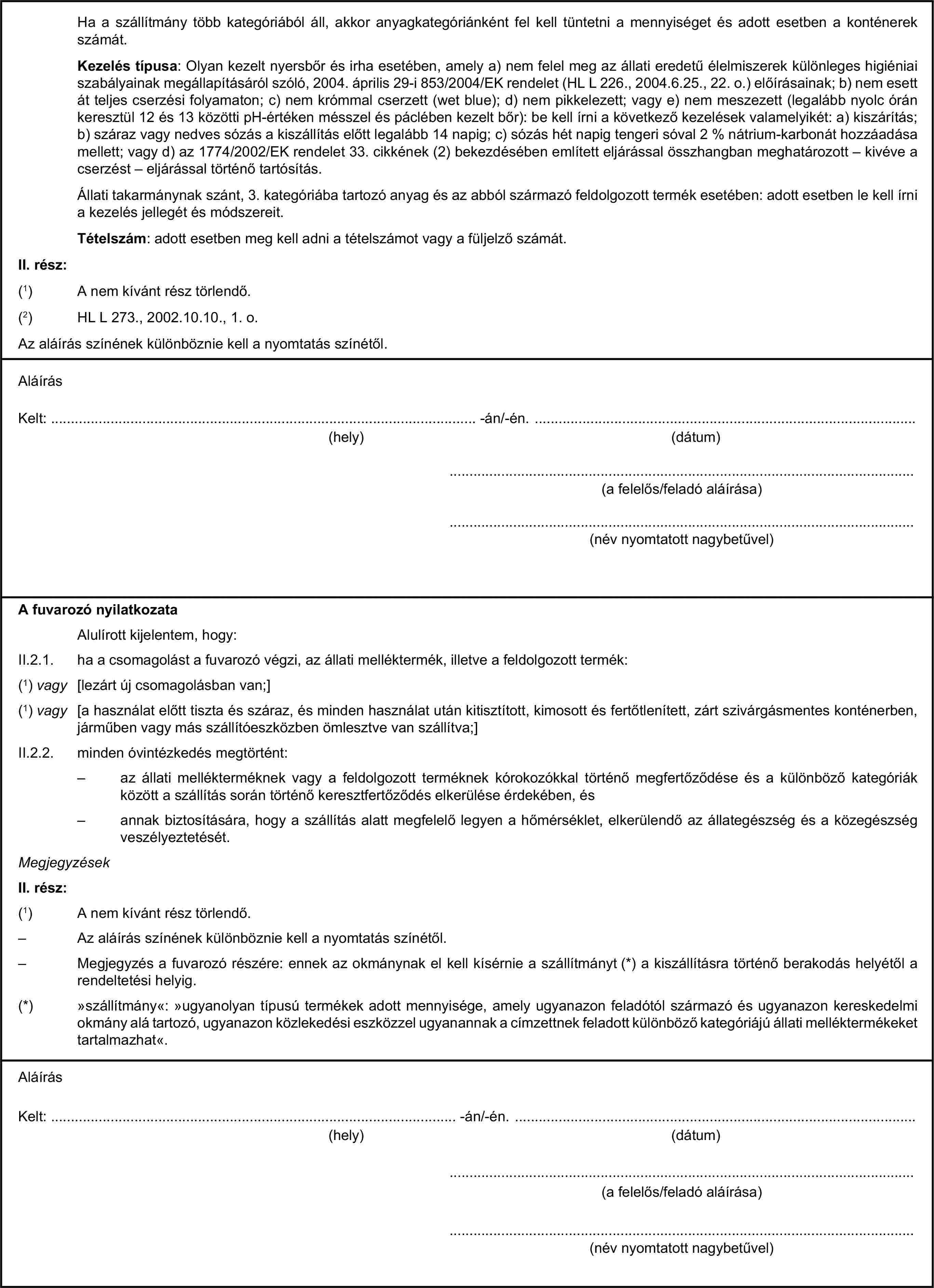 AZ ÁLLATI MELLÉKTERMÉKEK OSZTÁLYOZÁSA, ÖSSZEGYŰJTÉSE, SZÁLLÍTÁSA, ÁRTALMATLANÍTÁSA, FELDOLGOZÁSA, FELHASZNÁLÁSA ÉS KÖZBENSŐ TÁROLÁSA