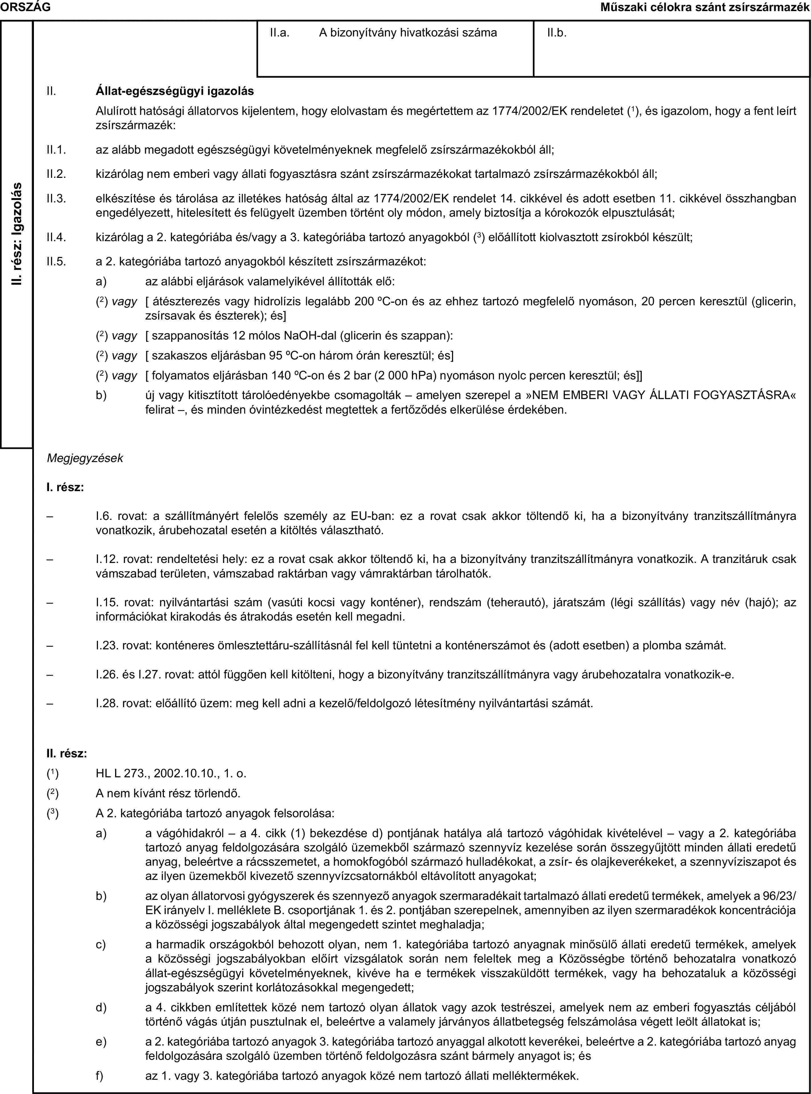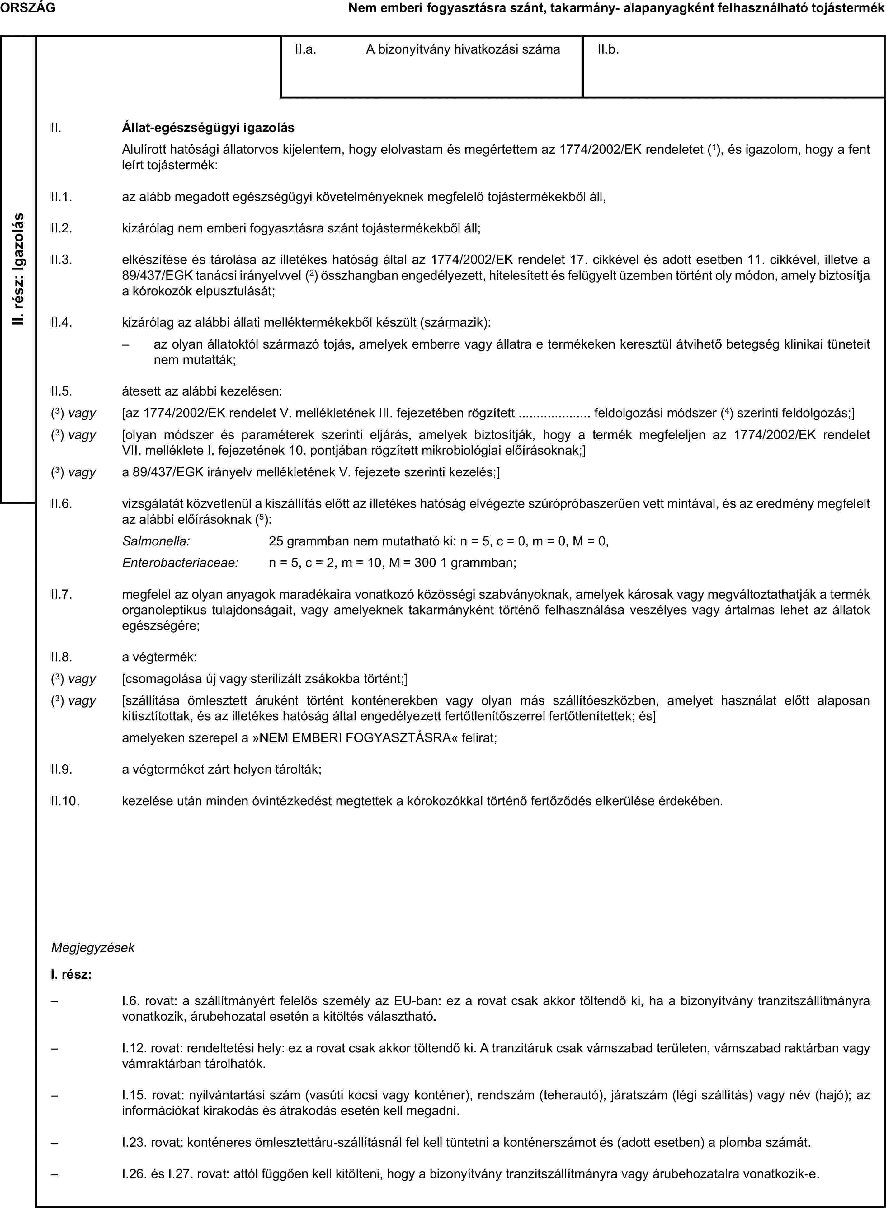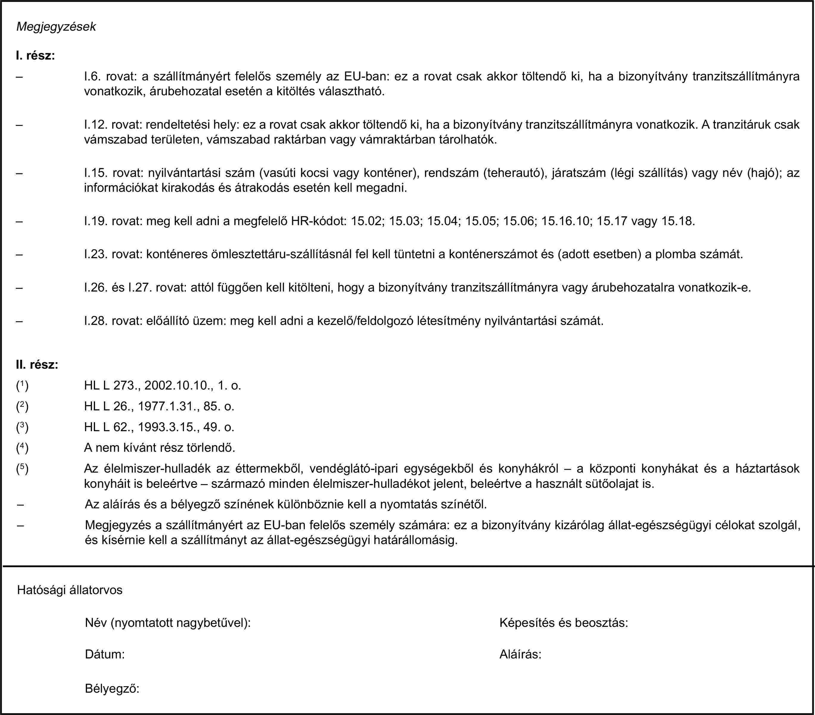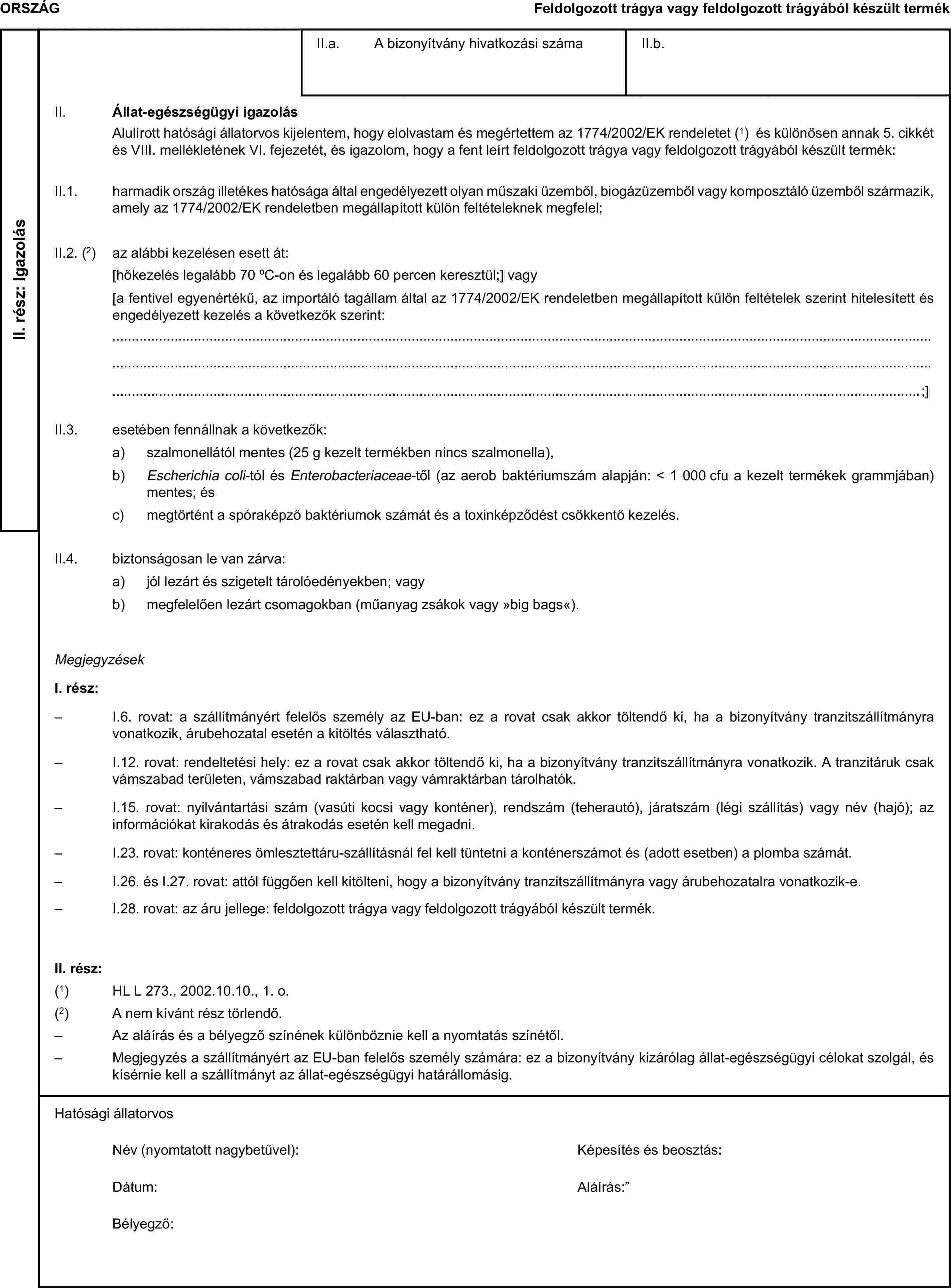 [1] A dokumentum eredetije megtekinthető CELEX: 32002R1774 - https://eur-lex.europa.eu/legal-content/HU/ALL/?uri=CELEX:32002R1774&locale=hu Utolsó elérhető, magyar nyelvű konszolidált változat CELEX: 02002R1774-20100928 - https://eur-lex.europa.eu/legal-content/HU/ALL/?uri=CELEX:02002R1774-20100928&locale=hu