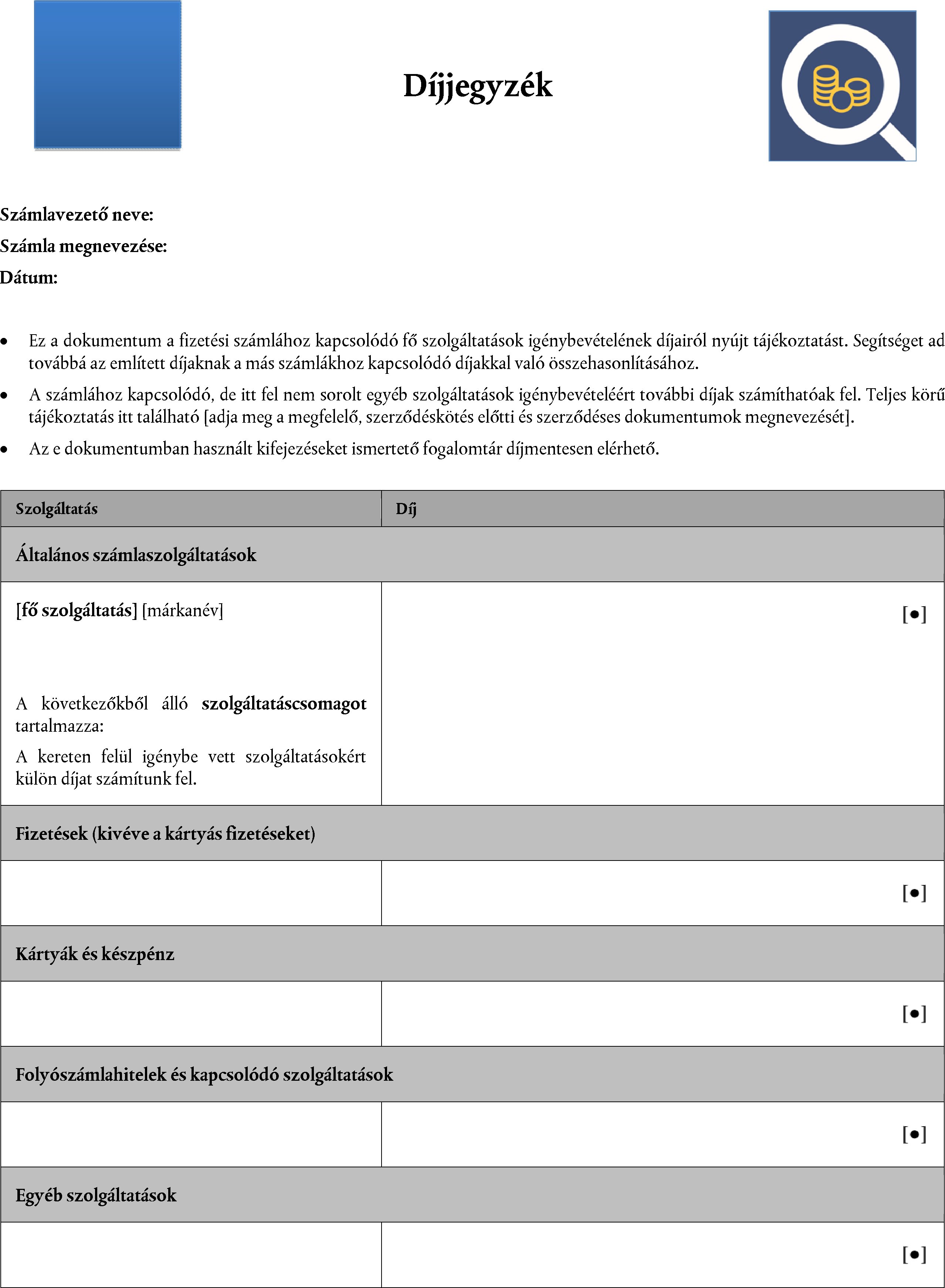 b) tartalmazza a "Díjjegyzék" címet az első oldal tetején középen, a pénzforgalmi szolgáltatónak a dokumentum bal felső sarkában látható logója, valamint a dokumentum jobb felső sarkában látható egységes szimbólum között;