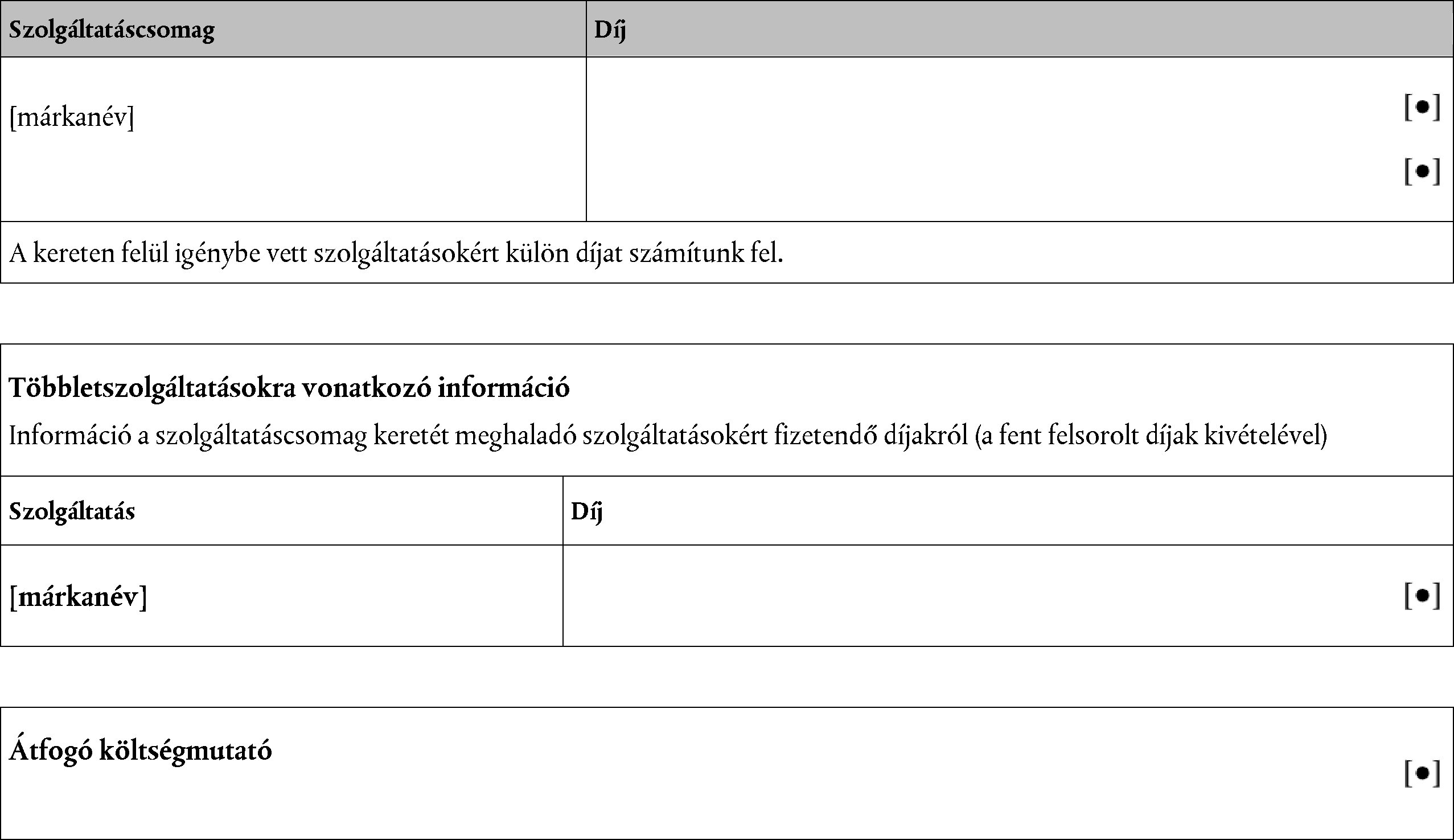 (1) Amennyiben a pénzforgalmi szolgáltató a számlával a fizetési számlához kapcsolódó szolgáltatáscsomagot kínál, és a szóban forgó szolgáltatáscsomagot az "Általános számlaszolgáltatások" alcímhez tartozó, a szolgáltatásokat és díjakat tartalmazó táblázatban feltüntetett díjaktól elkülönítve számítja fel, a pénzforgalmi szolgáltatók a szolgáltatáscsomagra vonatkozó táblázatban feltüntetik a következőket: