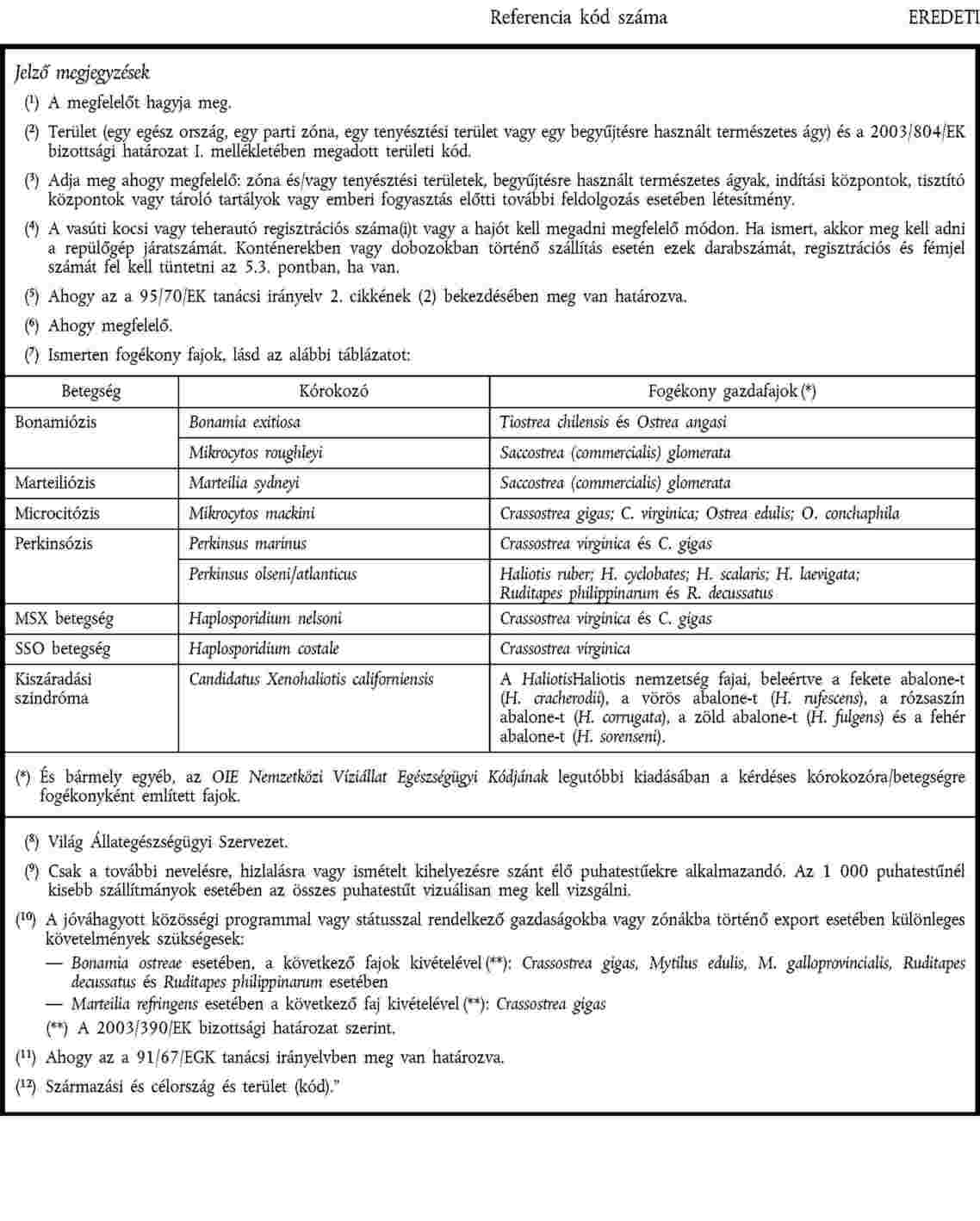 (2) A továbbtenyésztés, hízlalás vagy ismételt kihelyezés céljából a Közösségbe behozott élő puhatestűek, azok ikrái és ivarsejtjei esetében a 282/2004/EK bizottsági rendeletben előírt közös állatorvosi belépési dokumentumot kell kitölteni ennek megfelelően.