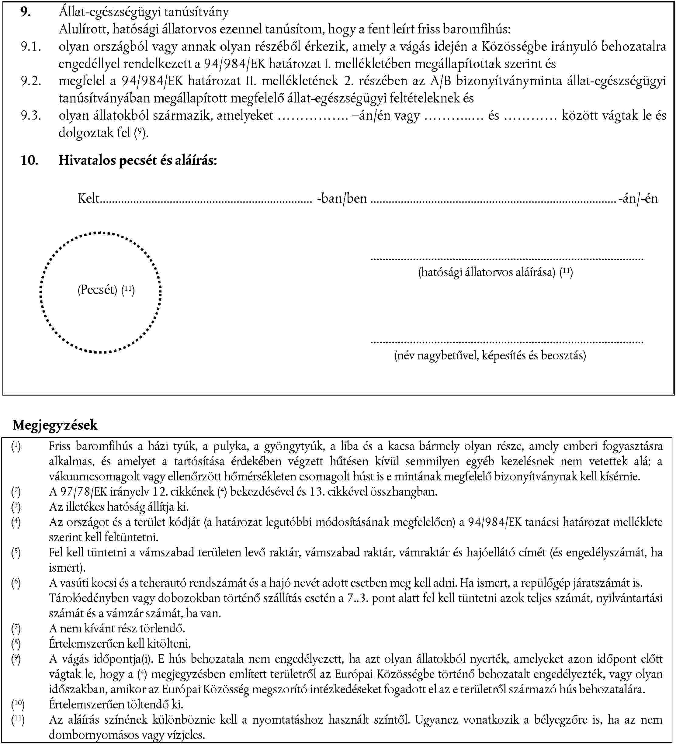 Megjegyzés:az A és B betűk a II. melléklet 2. részében meghatározott bizonyítványmintákra vonatkoznak.