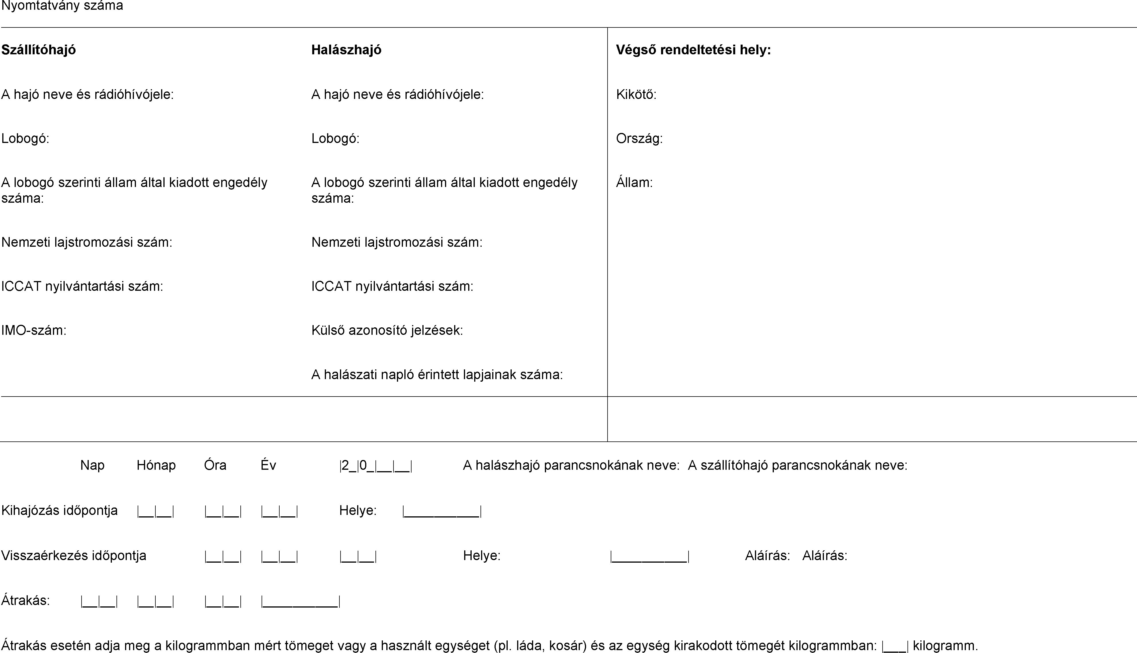 1. A vontatóhajó üzemeltetőjének át kell nyújtani a BCD-t, amelynek 2. szakaszát (Összes fogás), 3. szakaszát (Élő halak kereskedelme) és 4. szakaszát (Áthelyezés - az elpusztult halakat is beleértve) már kitöltötték.