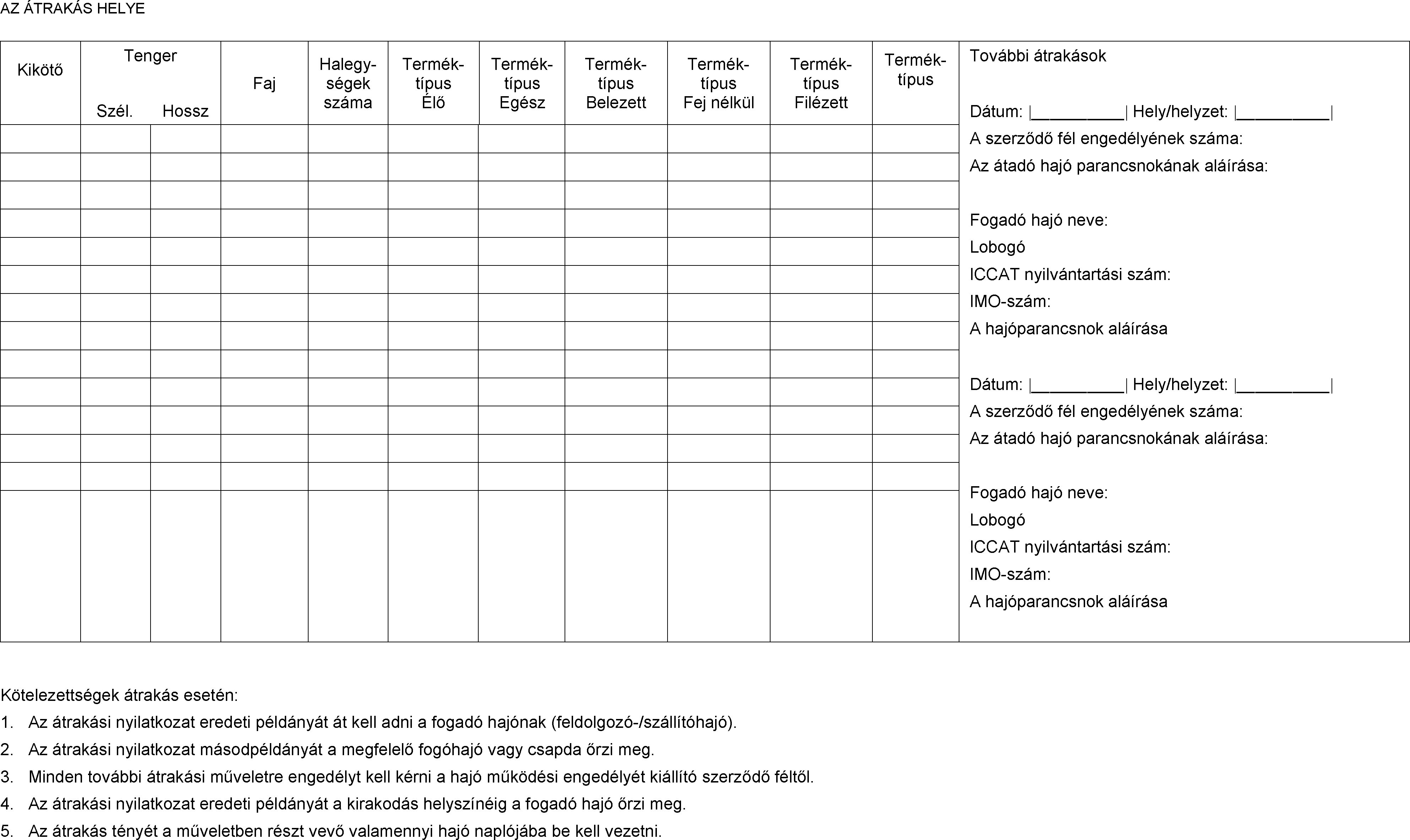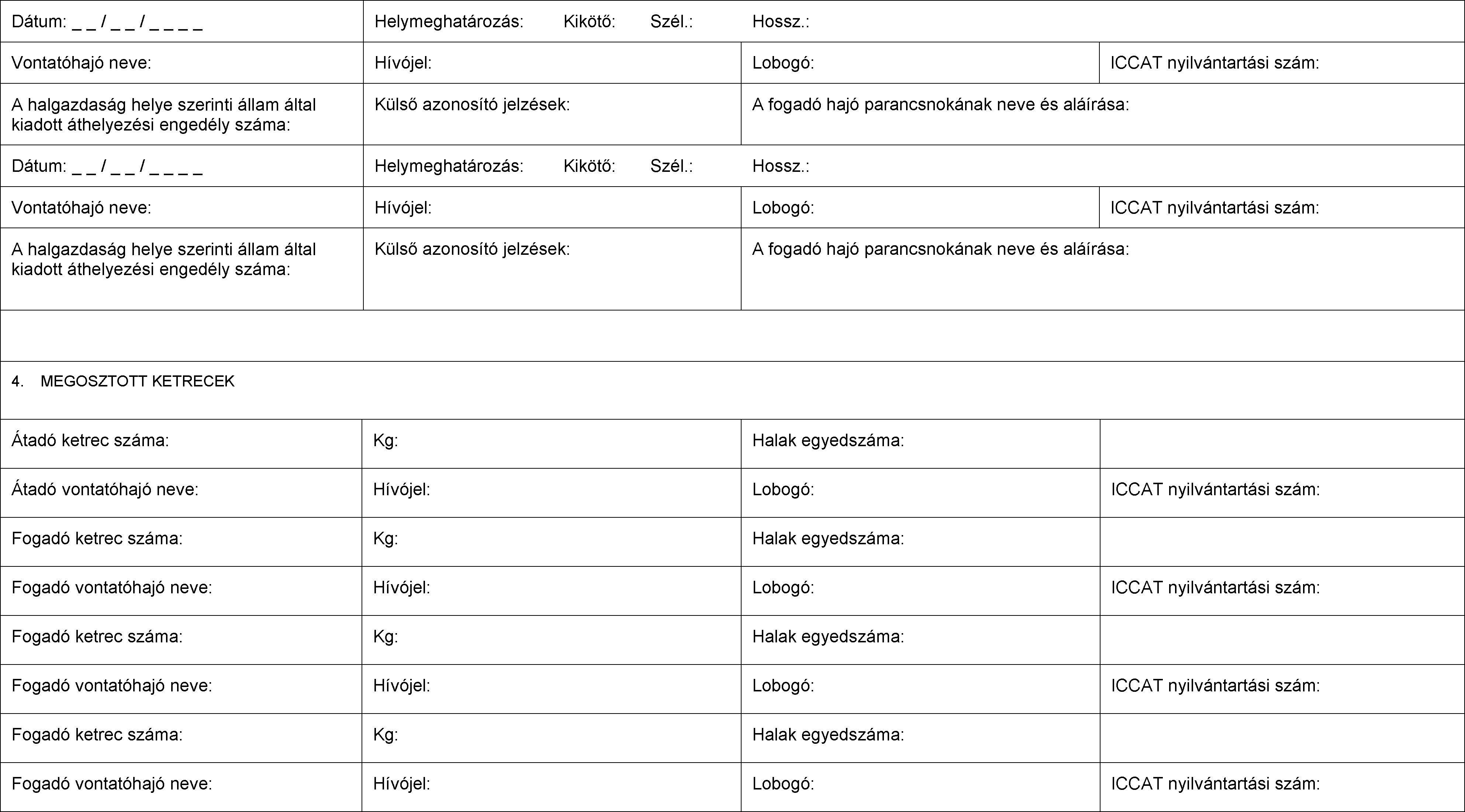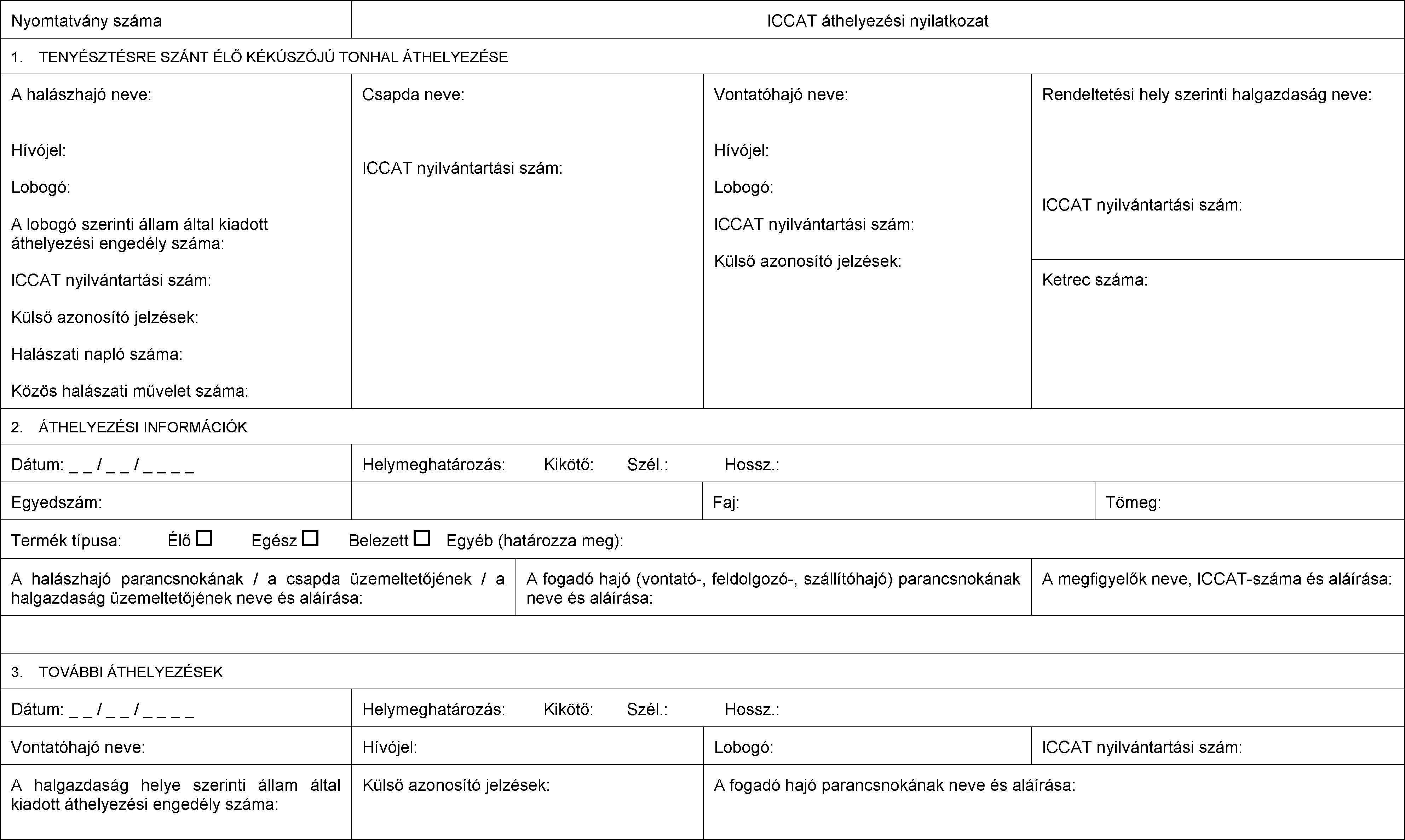 A 3. és 4. szakaszban bejelentett összmennyiségeknek meg kell egyezniük a 2. szakaszban megadott mennyiségekkel. A BCD-t e rendelet előírásainak megfelelően az eredeti ICCAT áthelyezési nyilatkozatnak (a továbbiakban: ITD) kell kísérnie. Az ITD-ben szereplő mennyiségeknek (élve áthelyezett halak) meg kell egyezniük a kapcsolódó BCD 3. szakaszában megadott mennyiségekkel.