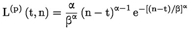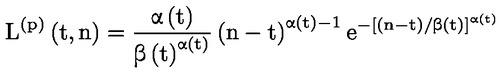 L (p) (t, n) = a t évben forgalomba hozott elektromos és elektronikus berendezések által alkotott tétel kiselejtezésalapú élettartamprofilja, amely tükrözi a tétel valószínű kiselejtezési arányát az n értékelési évben (a kiselejtezett berendezések százalékos aránya az n évben elért teljes értékesítéshez képest); ez egy Weibull-eloszlási függvény segítségével kerül kiszámításra, amely az időben változó α(t) alakparaméter és a β(t) skálaparaméter felhasználásával határozható meg a következőképpen: [Kép #1]