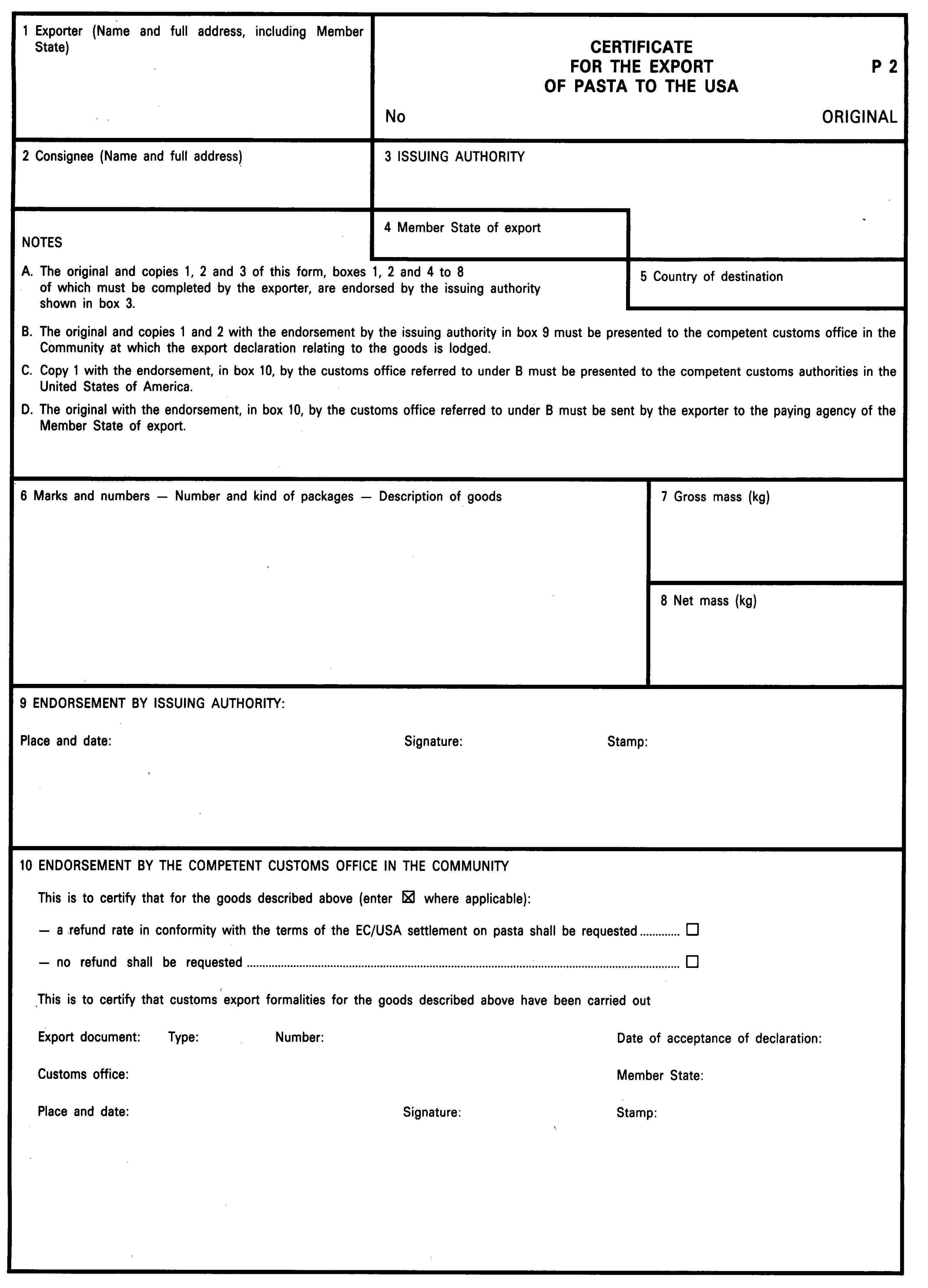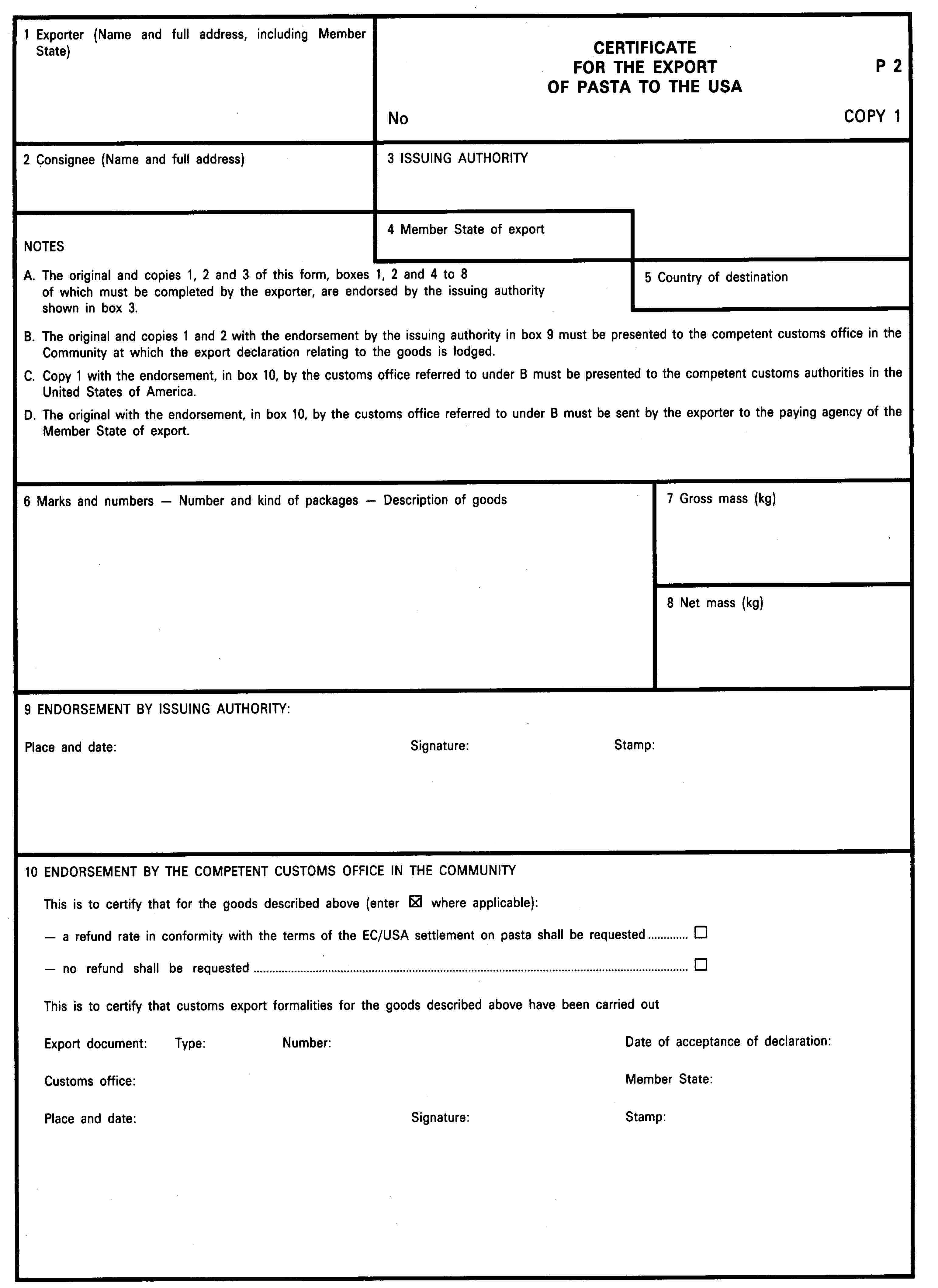 (1) A kombinált nómenklatúra 1902 11 00 és 1902 19 alszámai alá tartozó áruk Amerikai Egyesült Államokba történő exportja esetén annak a tagállamnak az illetékes hatóságai, ahol a kiviteli nyilatkozatot átveszik, az érintett felek kérelmére " Igazolás száraztészta USA-ba irányuló kiviteléhez" elnevezésű igazolást ad ki (a továbbiakban: "P 2 igazolás").