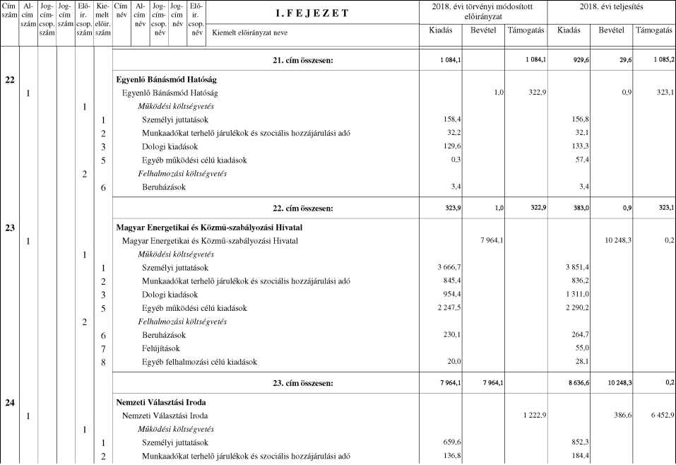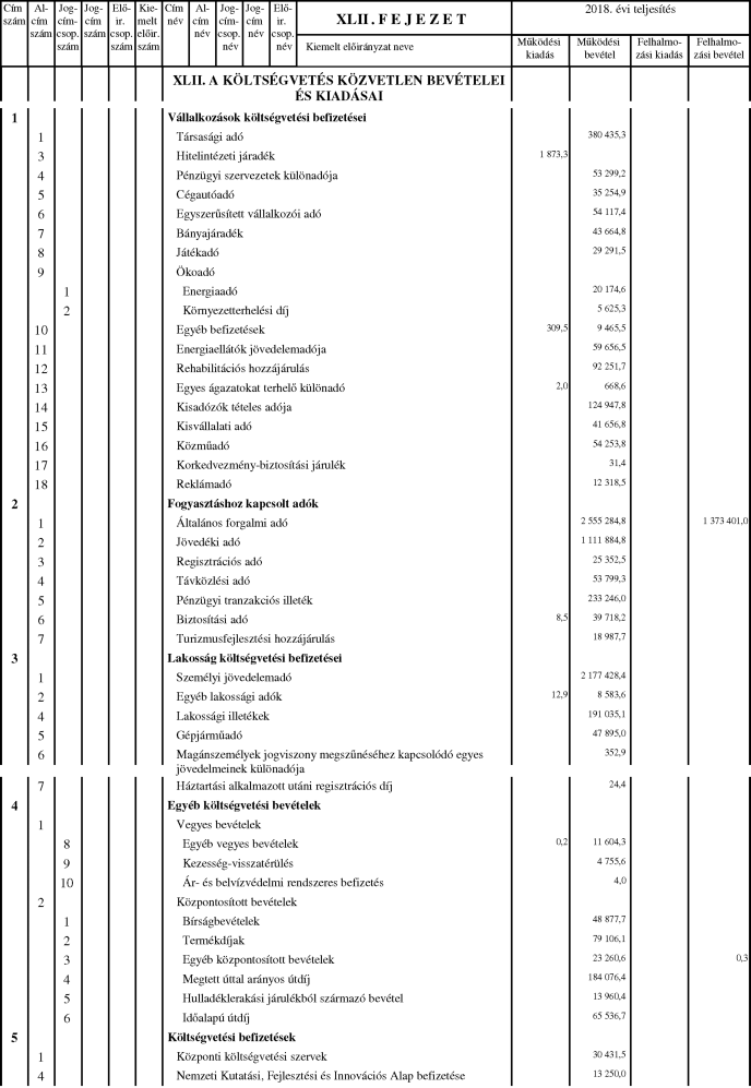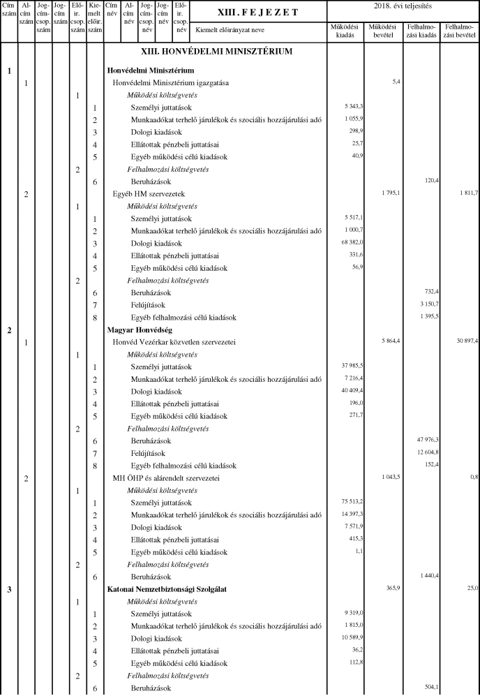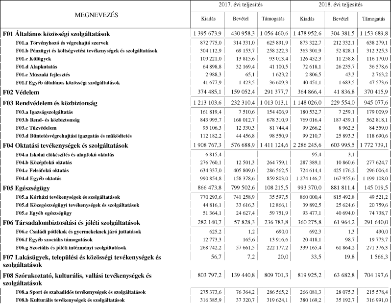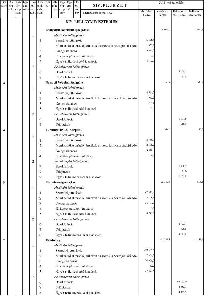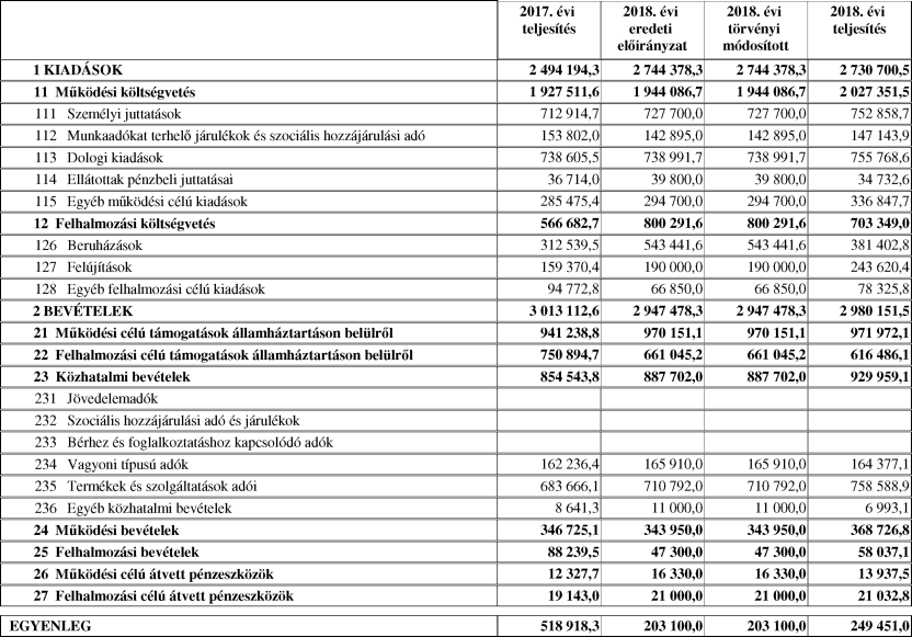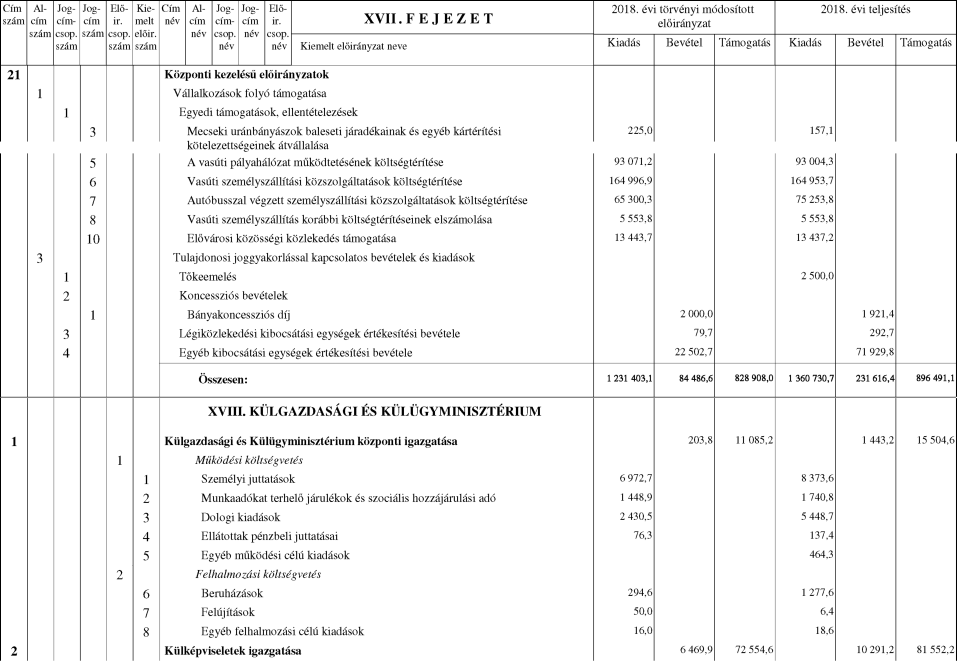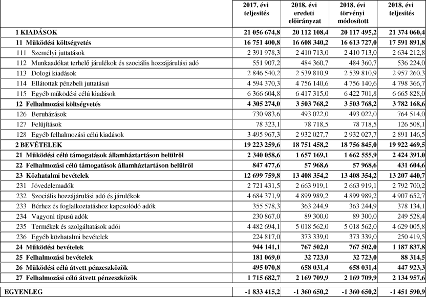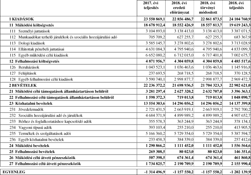 A központi alrendszer kiadási és bevételi előirányzatainak teljesítését az 1. melléklet tartalmazza a 2018. december 31-én fennálló besorolási rendnek megfelelően.