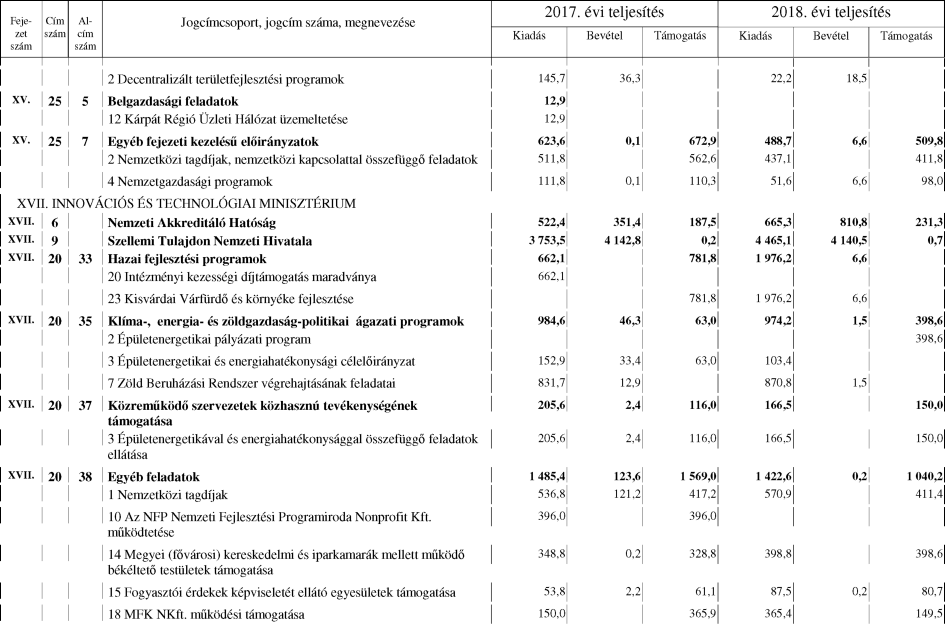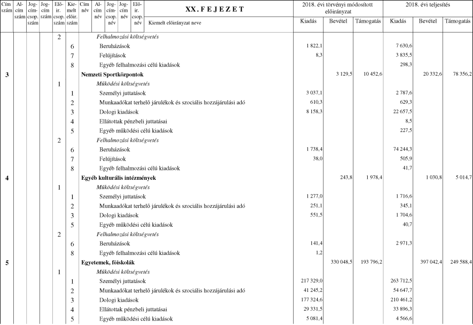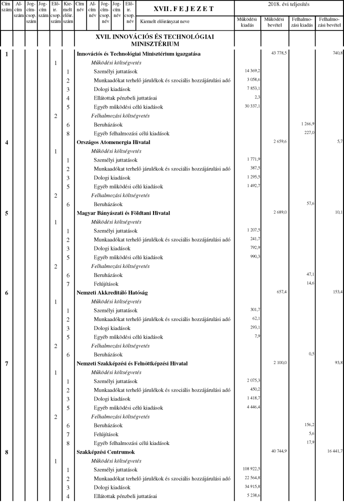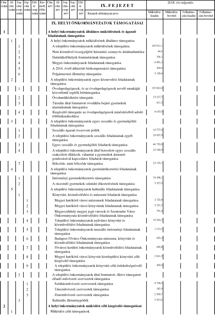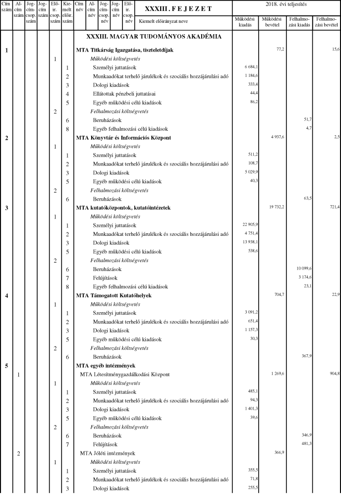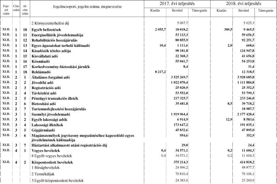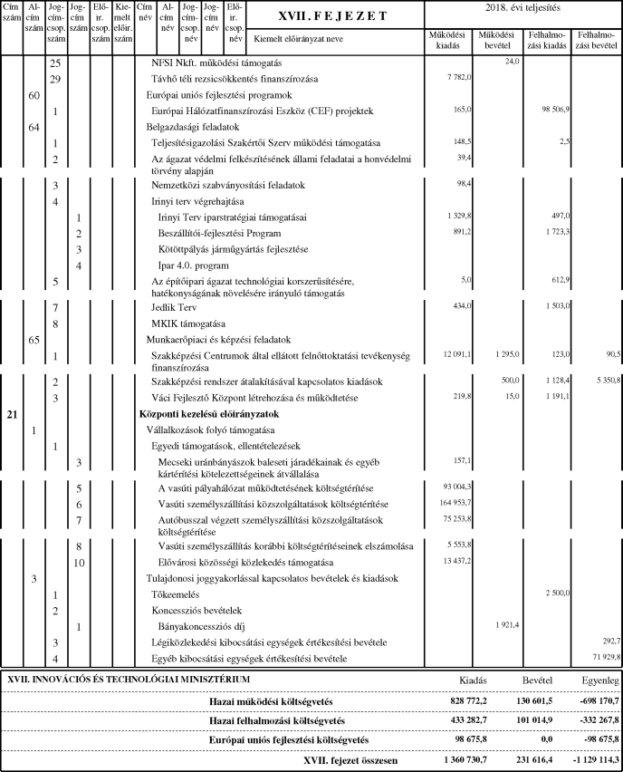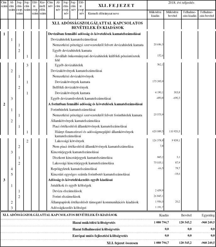 A központi alrendszer kiadási és bevételi előirányzatainak teljesítését az 1. melléklet tartalmazza a 2018. december 31-én fennálló besorolási rendnek megfelelően.