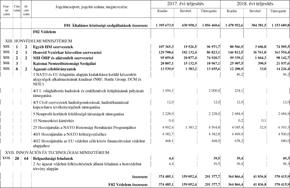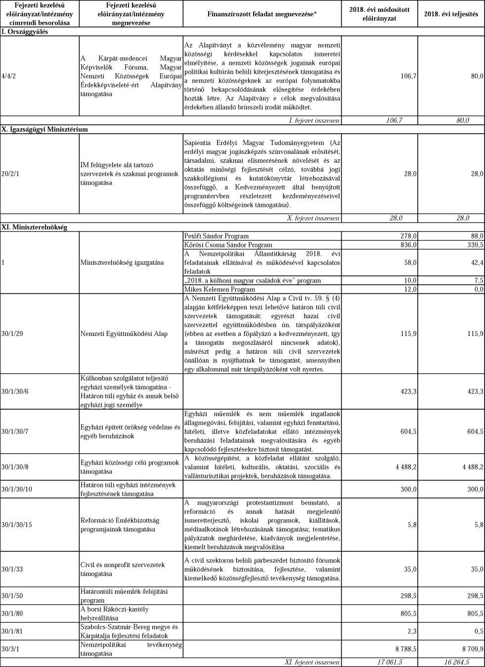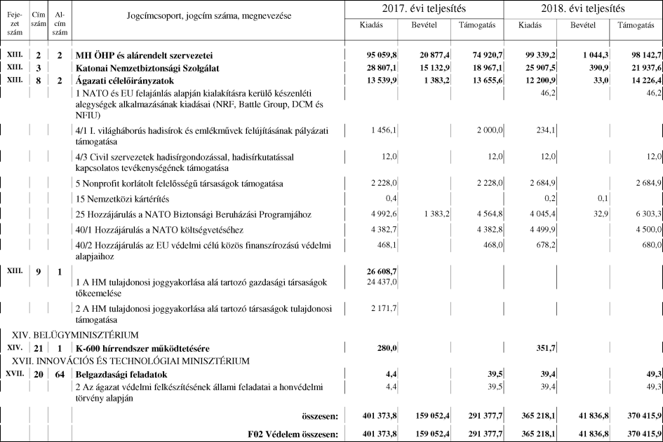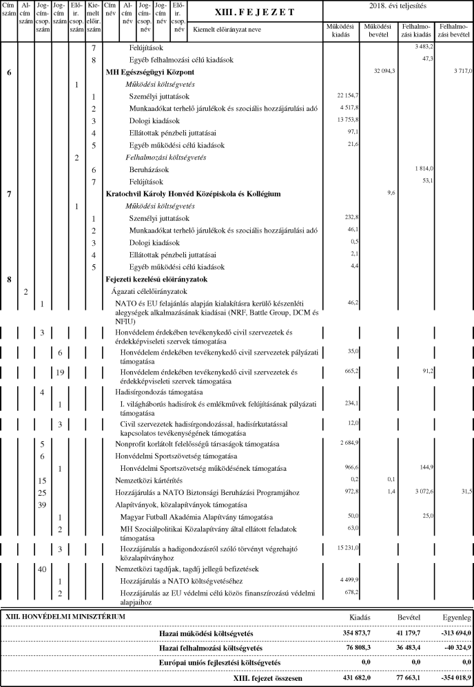 Kimutatás az Országvédelmi Alap előirányzat 2018. évi felhasználásáról fejezetenként