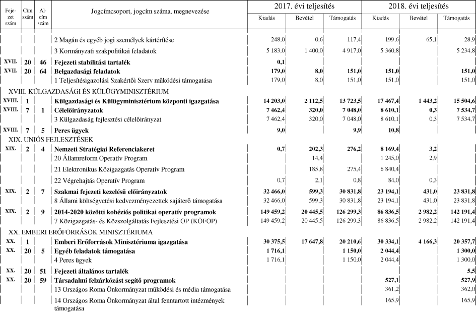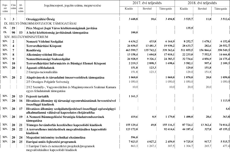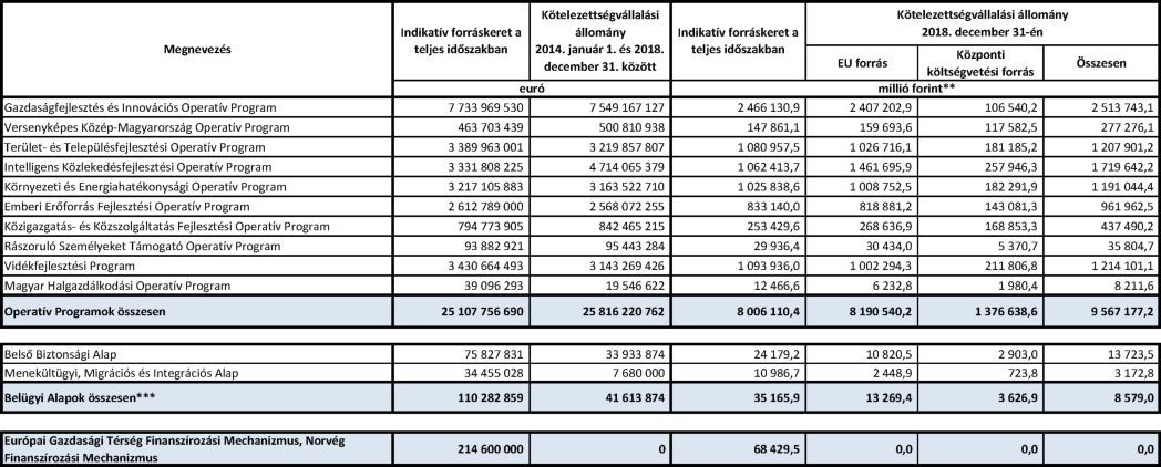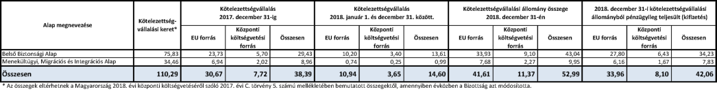 Az Országgyűlés a 2014-2020-as programozási időszakra elfogadott Partnerségi Megállapodás keretében, valamint a Belügyi alapokból finanszírozott programok, projektek esetén az uniós forrásokra és a kapcsolódó központi költségvetési finanszírozásra vonatkozó, a Kvtv. 30. § (1) és (2) bekezdése alapján tett, 2018. december 31-én fennálló kötelezettségvállalási állományt az 5. mellékletben meghatározott összegben hagyja jóvá.