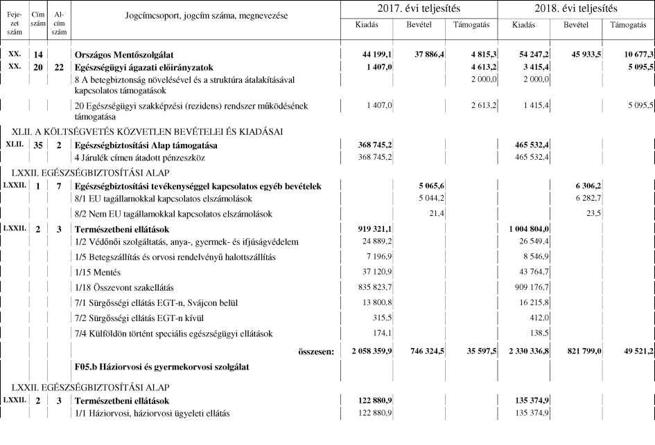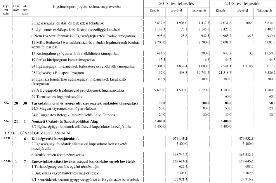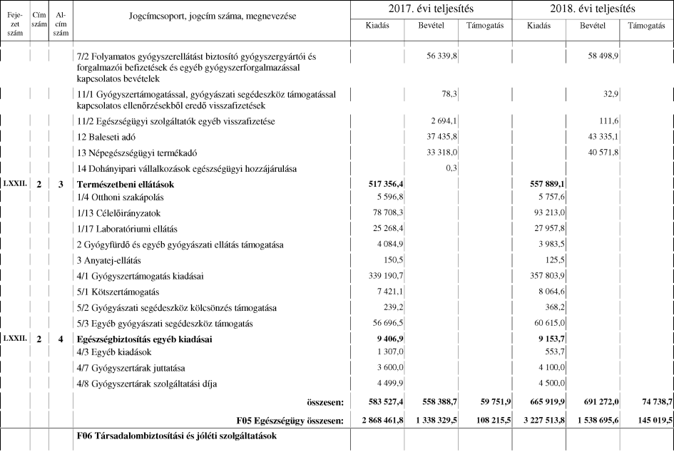 b) a LXXII. Egészségbiztosítási Alap fejezetnél az adott előirányzat terhére méltányossági ellátásra a 2. cím, 2. Egészségbiztosítás pénzbeli ellátásai alcímen belül az 1. Csecsemőgondozási díj, Terhességi-gyermekágyi segély, a 2. Táppénz, a 6. Gyermekgondozási díj jogcímcsoport előirányzatoknál együttesen 133,8 millió forint, rokkantsági, rehabilitációs ellátások megállapítására 128,7 millió forint, a 3. Természetbeni ellátások alcímen belül az 1. Gyógyító-megelőző ellátás jogcímcsoportnál 2 609,9 millió forint, a 4. Gyógyszertámogatás jogcímcsoportnál 24 853,2 millió forint, az 5. Gyógyászati segédeszköz támogatás jogcímcsoportnál 1 578,4 millió forint