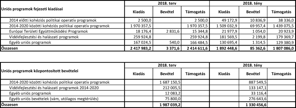 Uniós programok központosított bevételei, hozzájárulás az EU költségvetéséhez