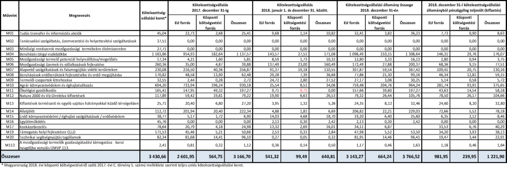A Vidékfejlesztési Program kötelezettségvállalási keretelőirányzatának és pénzügyi teljesülésének alakulása intézkedés szerinti bontásban