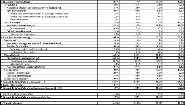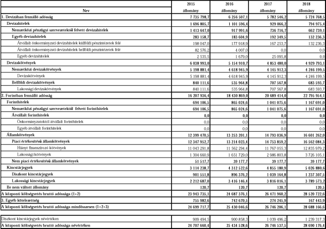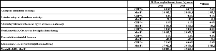 (1) A Kvtv. 3. §-ában meghatározott árfolyamokon az államháztartás 2018. december 31-én fennálló adóssága 29 970,5 milliárd forint.