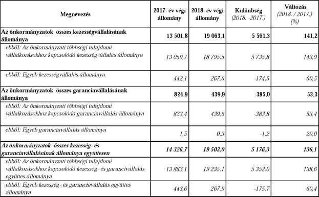 Az önkormányzatok kezesség- és garanciavállalása 2017. és 2018. év végi állományának alakulása