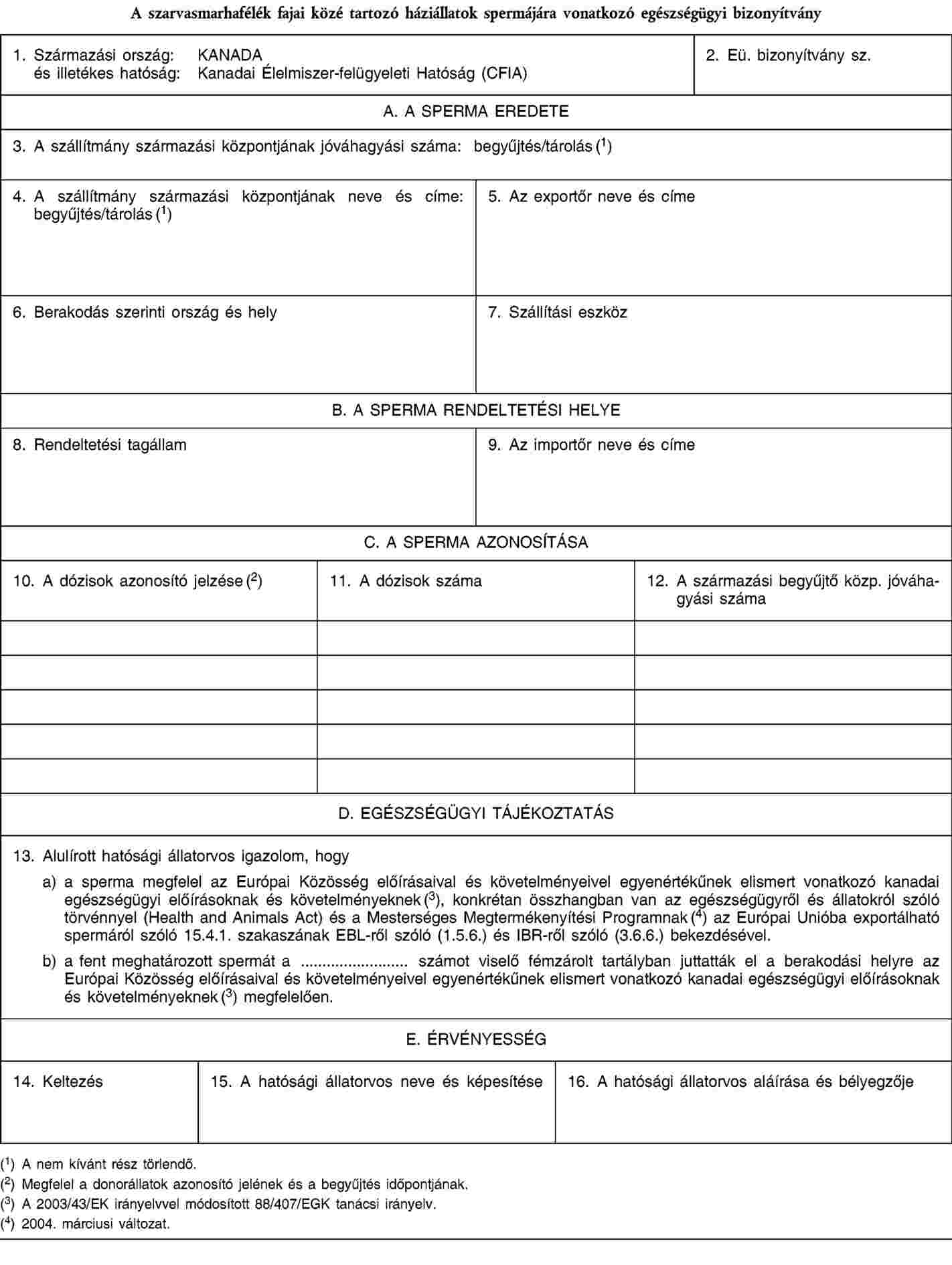A tagállamok engedélyezik a szarvasmarhafélék fajai közé tartozó háziállatok spermájának Kanadából történő behozatalát az I. mellékletben szereplő mintabizonyítványban megállapított tanúsítási feltételeknek megfelelően, és amennyiben azt egy a szállítmány Kanadából való elindulását megelőzően megfelelően kitöltött és kibocsátott ilyen bizonyítvány kíséri.