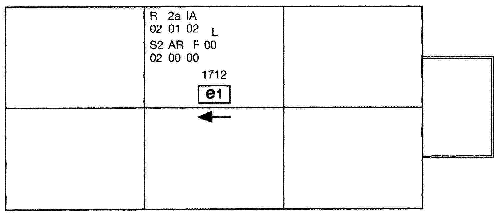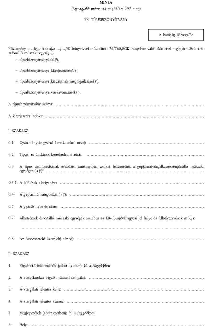 4.2.2. a téglalap alakú keret közelében a 70/156/EGK irányelv VII. mellékletében említett jóváhagyási szám 4. szakaszában található "alap típus-jóváhagyási szám", amely előtt - az EK-jóváhagyás megadása napján a 76/760/EGK irányelv legfrissebb főbb műszaki módosításaihoz rendelt sorszámot jelölve - két számjegy áll. Ezen irányelvben a sorszám 00;