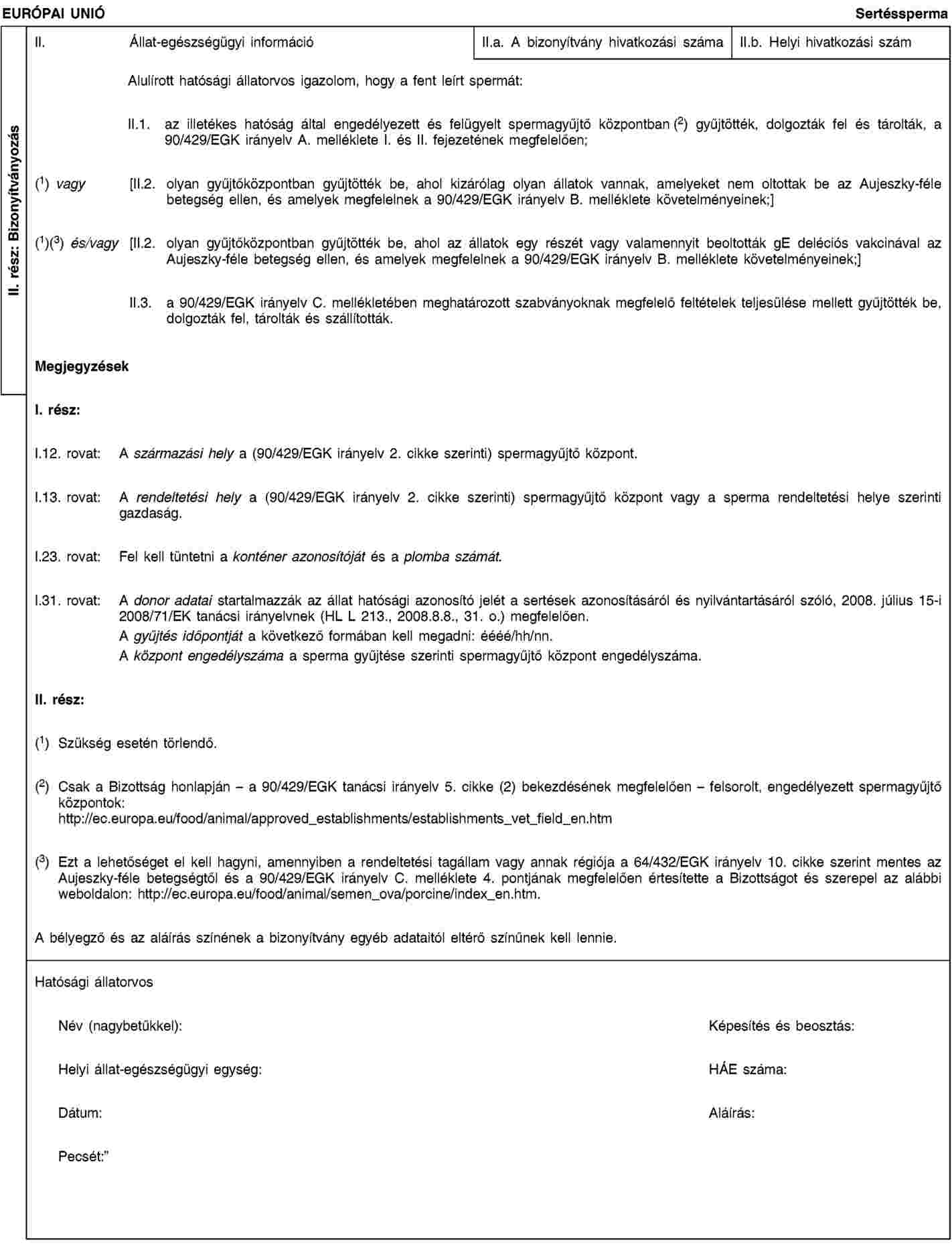 A házisertések spermájának Unión belüli kereskedelmében használatos állat-egészségügyi bizonyítványminta