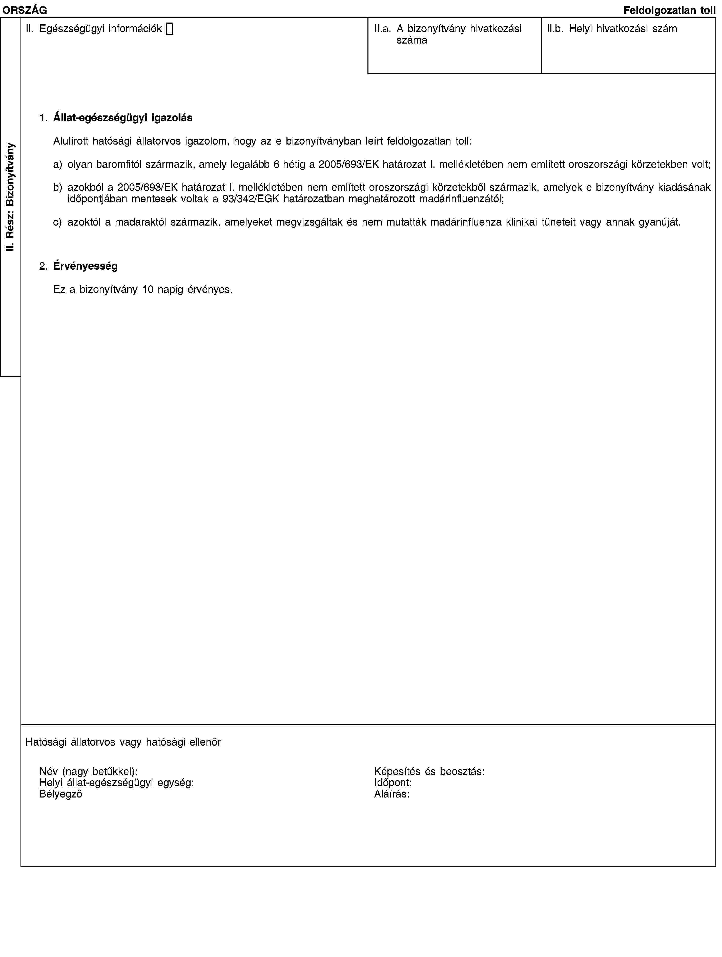 g) Az eredeti bizonyítványt egy hatósági állatorvosnak kell kitöltenie és aláírnia legkésőbb a Közösségbe történő export céljából történő berakodás előtt 24 órával. E célból az oroszországi illetékes hatóságok biztosítják a 96/93/EK tanácsi irányelvben megállapítottakkal egyenértékű tanúsítási elvek betartását.