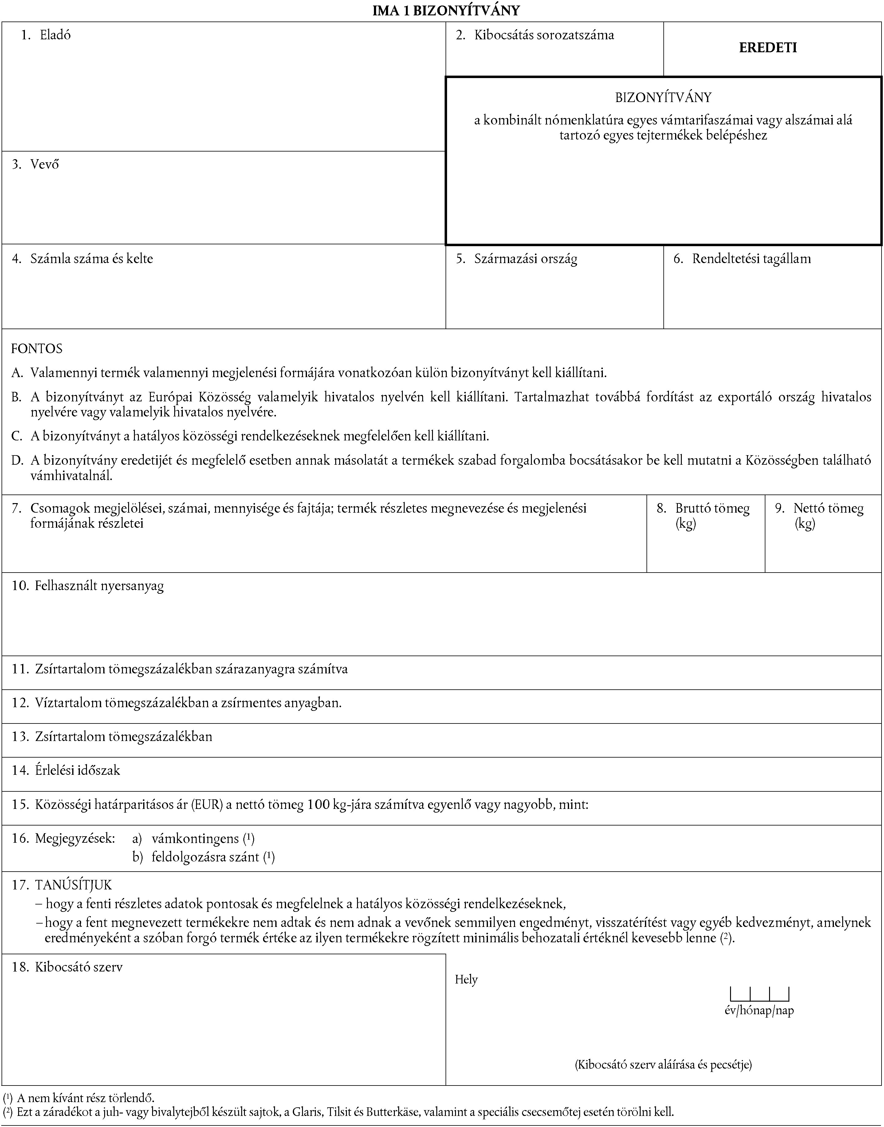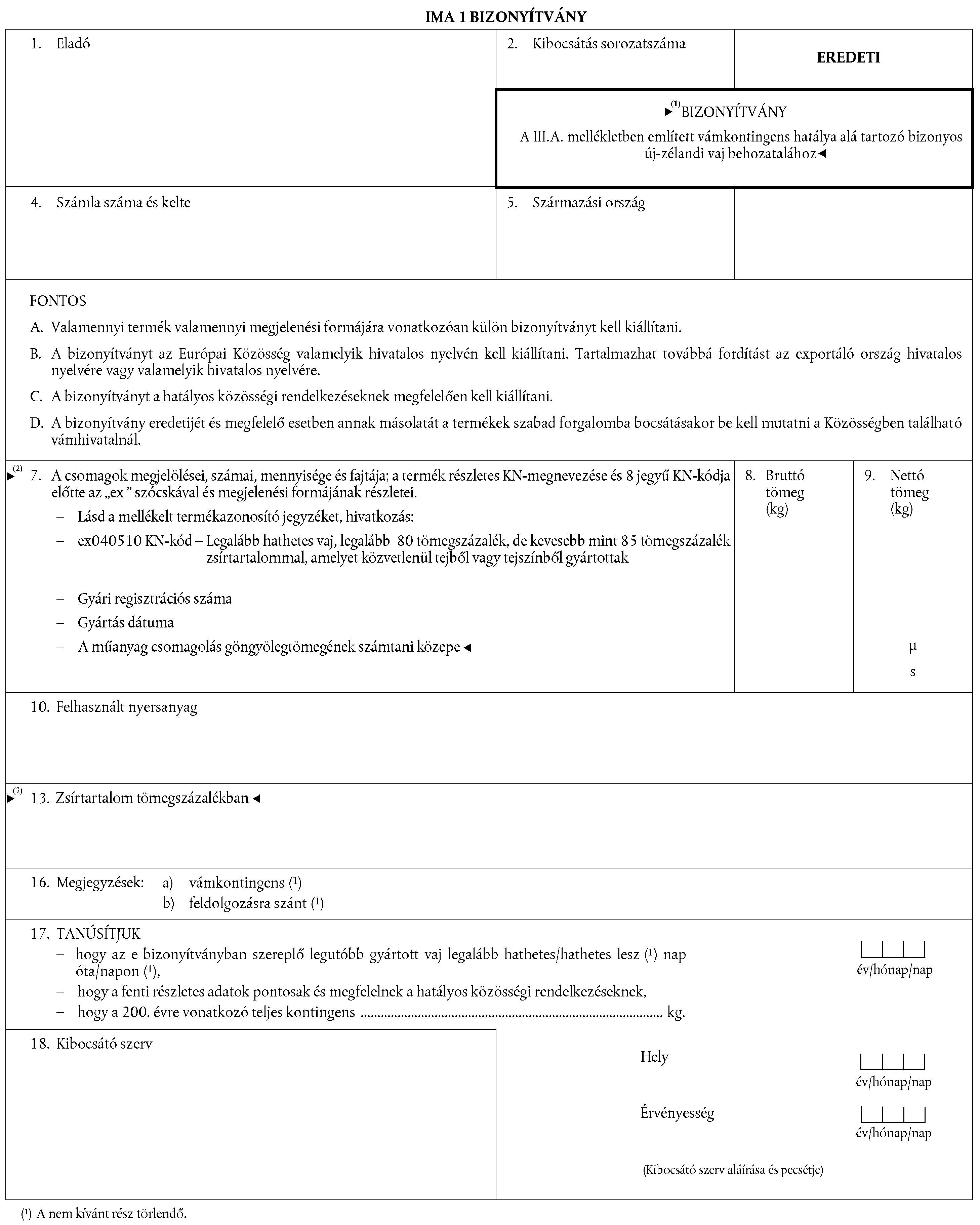 A vámhatóságok feltüntetik az IMA 1 bizonyítvány sorozatszámát az importengedélyen.