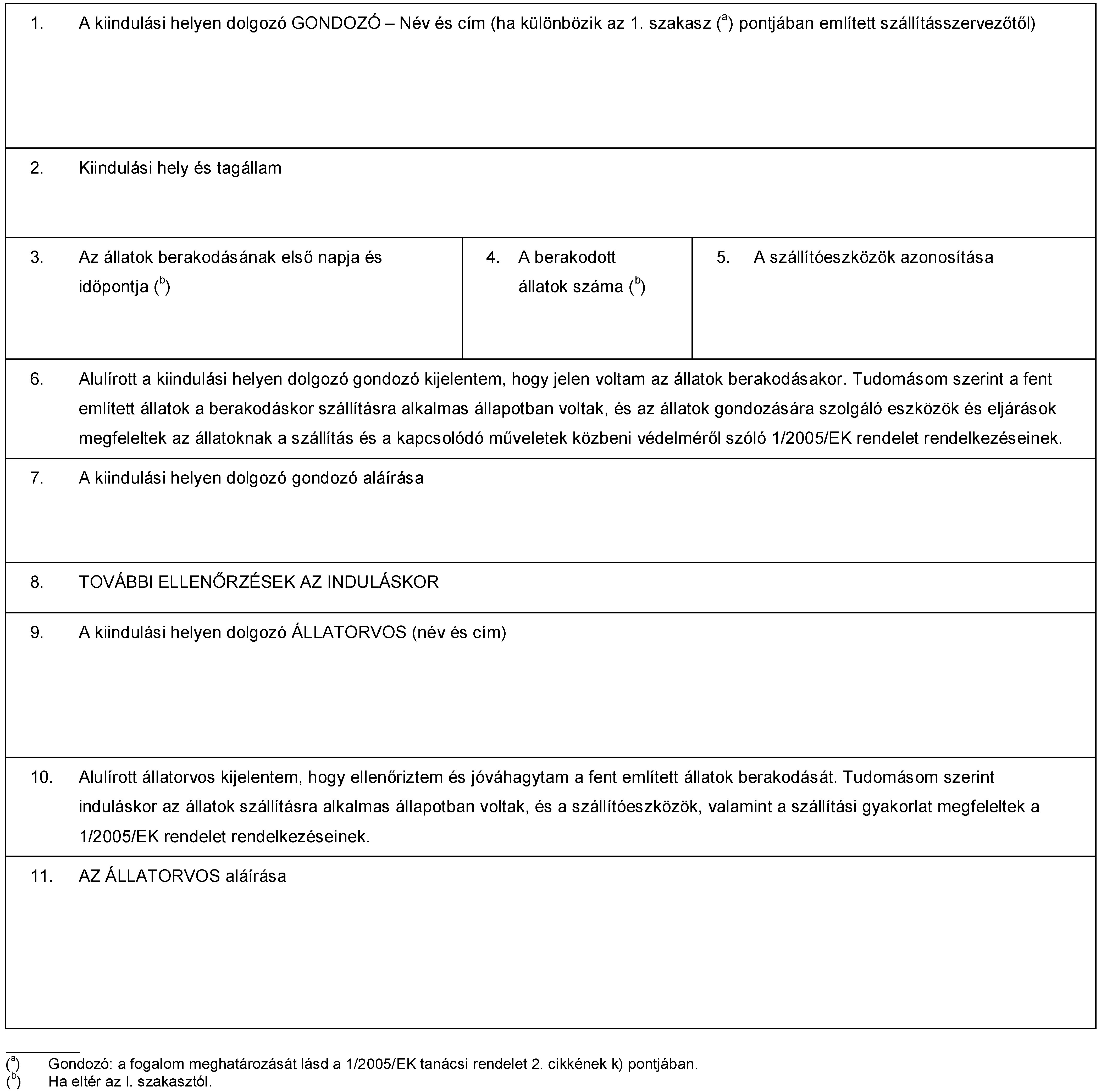 4. A kiindulási helyen dolgozó gondozók - valamint abban az esetben, ha a rendeltetési hely a Közösség területén belül található, a rendeltetési helyen dolgozó gondozók is - kitöltik és aláírják a menetlevél vonatkozó szakaszait. Az e rendelet rendelkezéseinek való megfeleléssel kapcsolatos bármilyen fenntartásról az 5. szakaszban szereplő formanyomtatvány segítségével mielőbb értesítik az illetékes hatóságot.