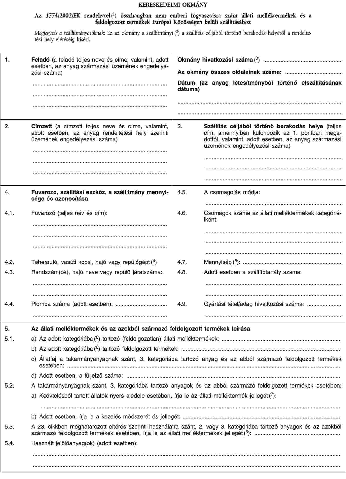 KERESKEDELMIOKMÁNY-MINTA AZ ÁLLATI MELLÉKTERMÉKEK ÉS FELDOLGOZOTT TERMÉKEK EURÓPAI KÖZÖSSÉGEN BELÜLI SZÁLLÍTÁSÁHOZ