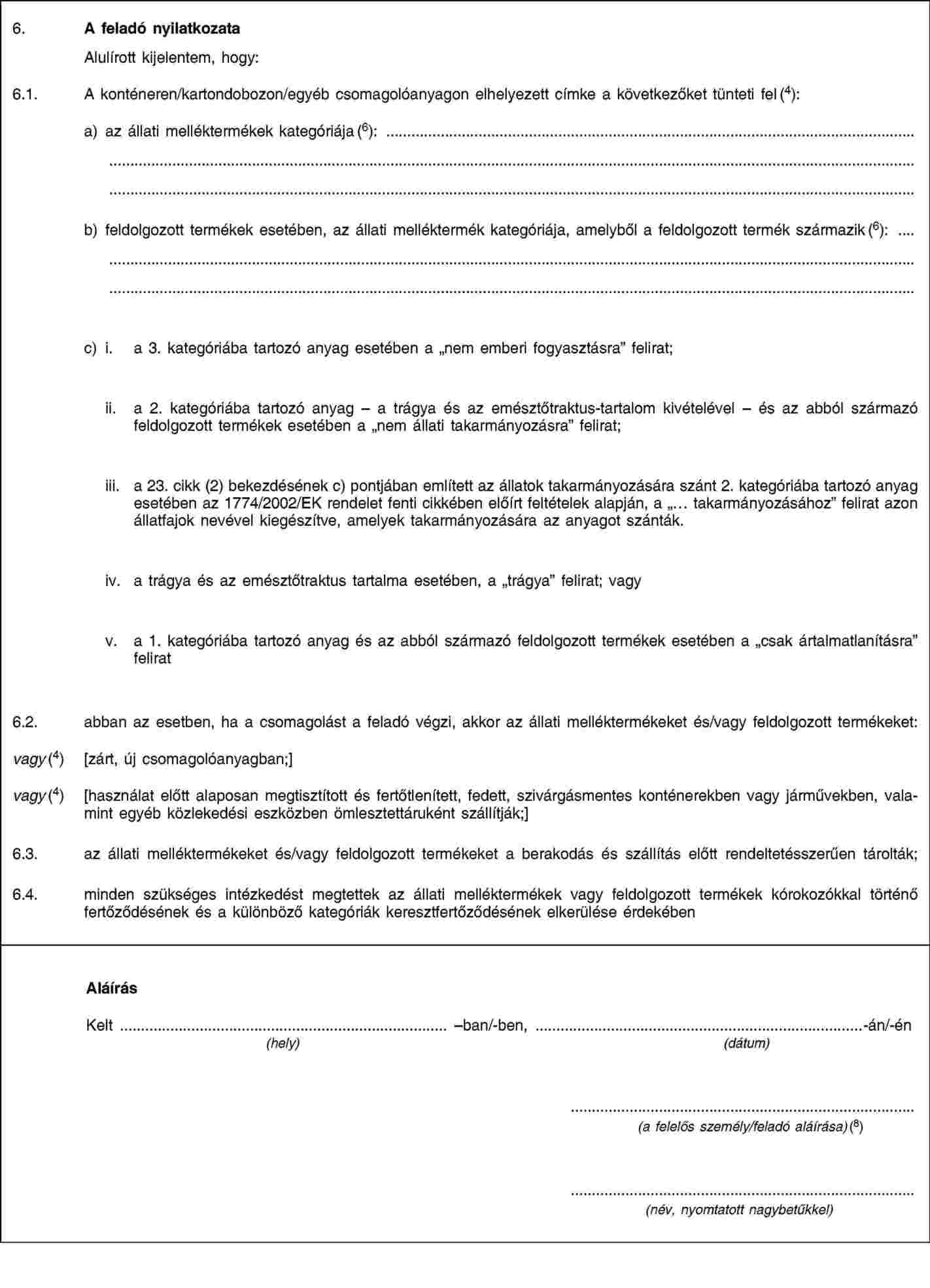 g) A bizonyítvány eredetijét a felelős személy tölti ki és írja alá. Ezáltal a felelős személy biztosítja az 1774/2002/EK rendelet II. mellékletének III. fejezetében meghatározott dokumentációs elvek betartását. A kereskedelmi okmányokon az alábbiaknak kell szerepelnie: