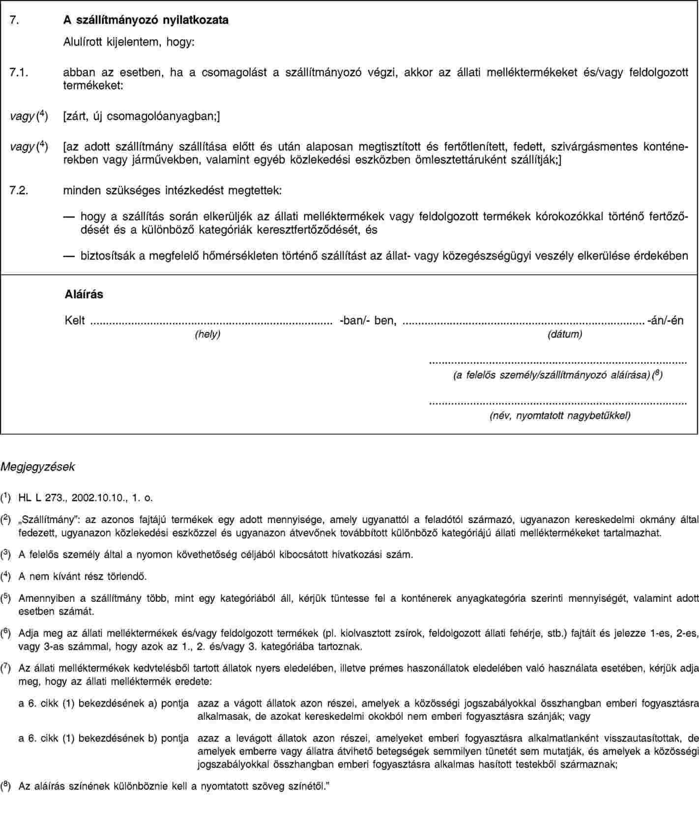 2. Amennyiben egynél több szállítmányozó is érintett, minden egyes szállítónak ki kell töltenie egy a kereskedelmi okmány 7. pontjában említett nyilatkozatot, amely azután az okmány részét képezi.