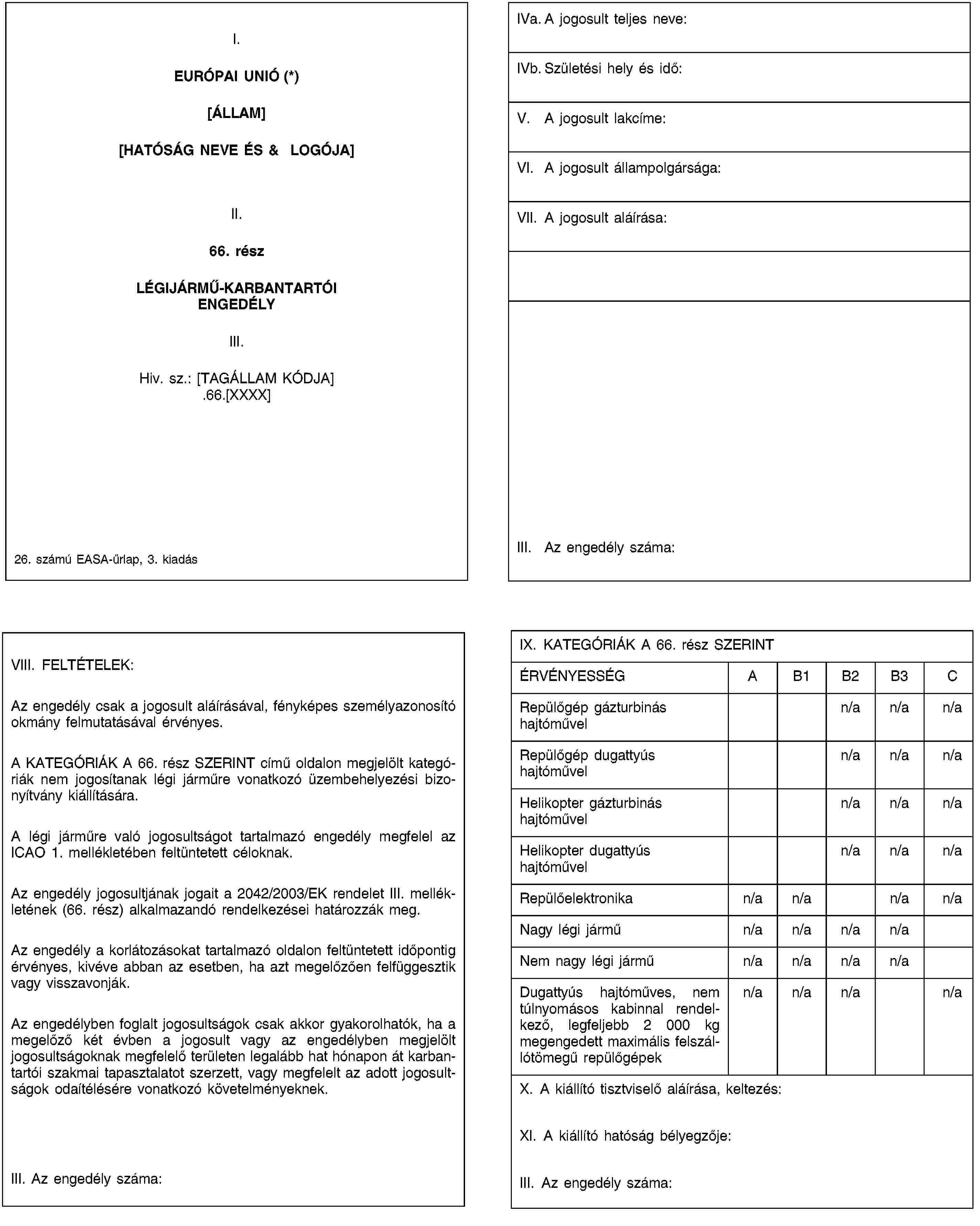 i. az - akár új, akár a III. melléklet 66.A.70. pontja értelmében elismert - légijármű-karbantartói engedélyeknek az illetékes hatóság általi, a III. melléklettel (66. rész) összhangban történő kibocsátásával kapcsolatos követelményt;