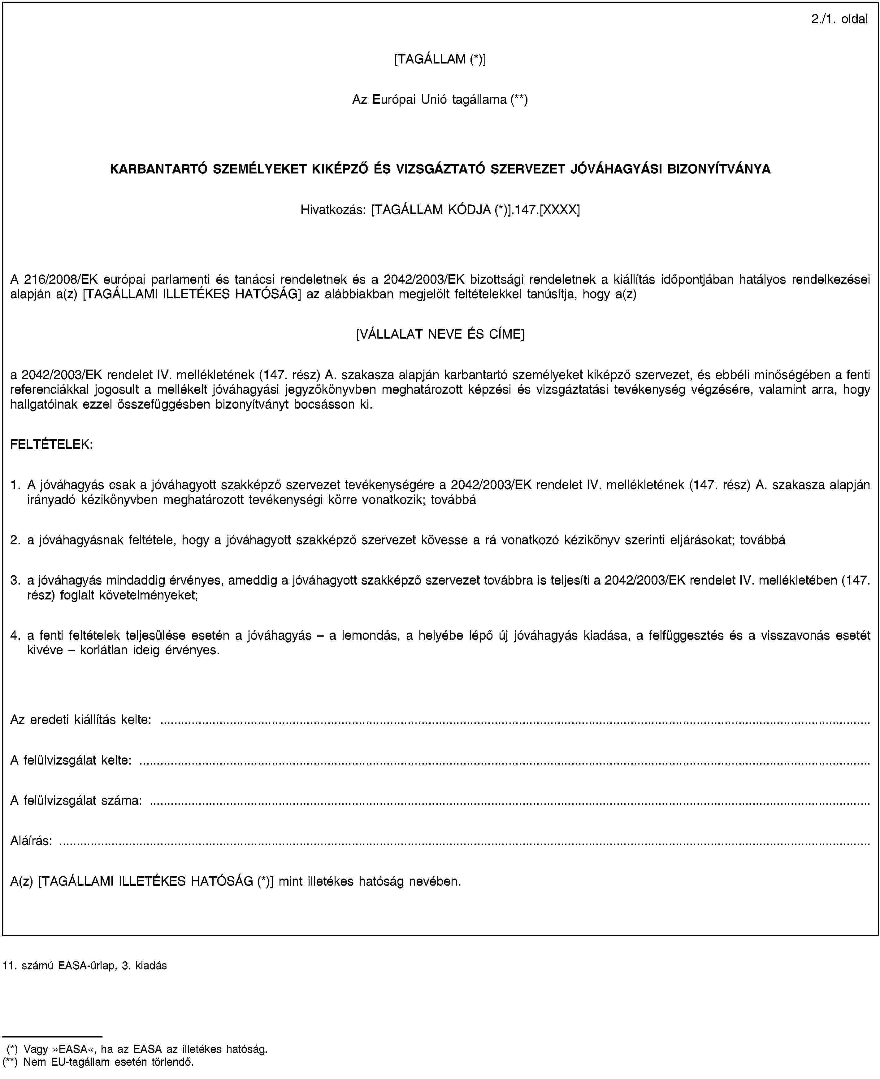 Karbantartó személyeket kiképző szervezet jóváhagyása a IV. melléklet (147. rész) szerint - 11. számú EASA-űrlap