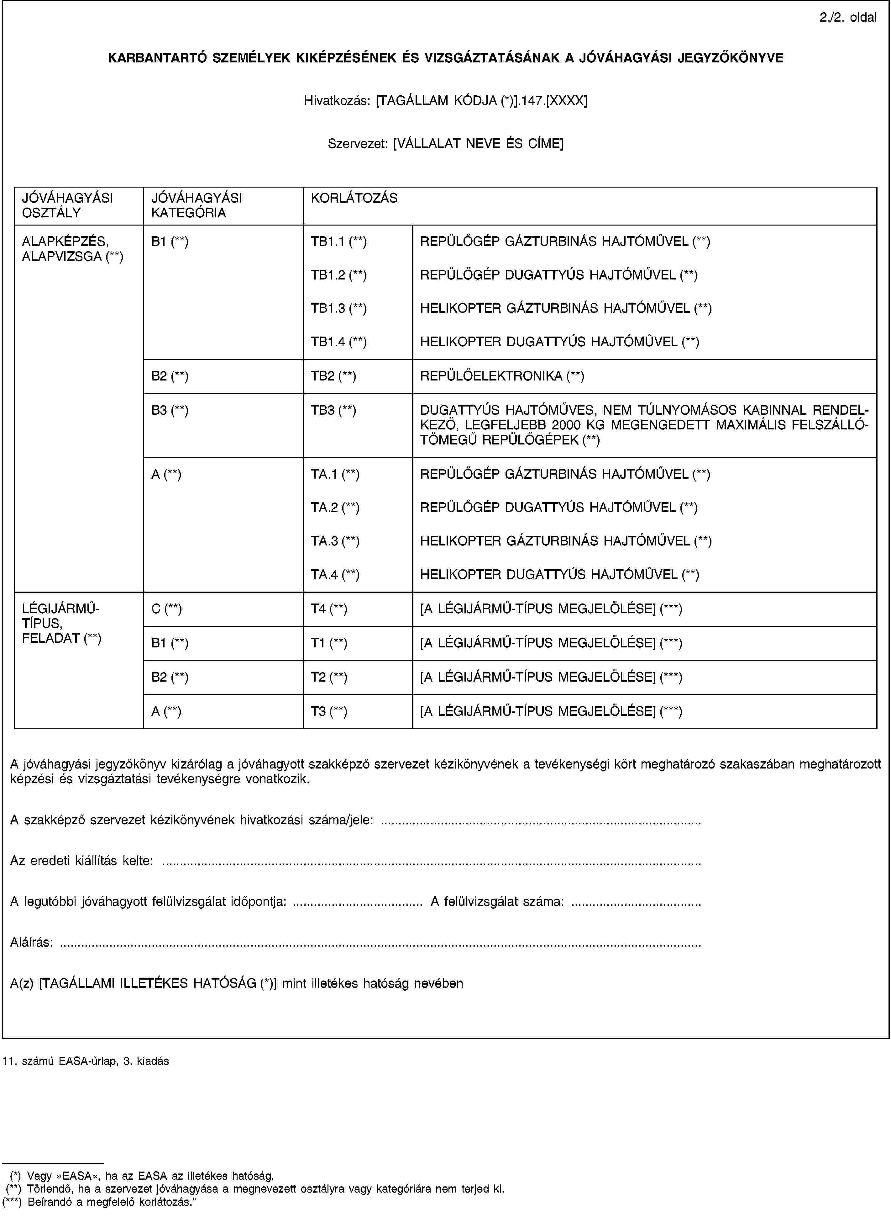 II. függelék - Karbantartó személyeket kiképző szervezet jóváhagyása a IV. melléklet (147. rész) szerint - 11. számú EASA-űrlap