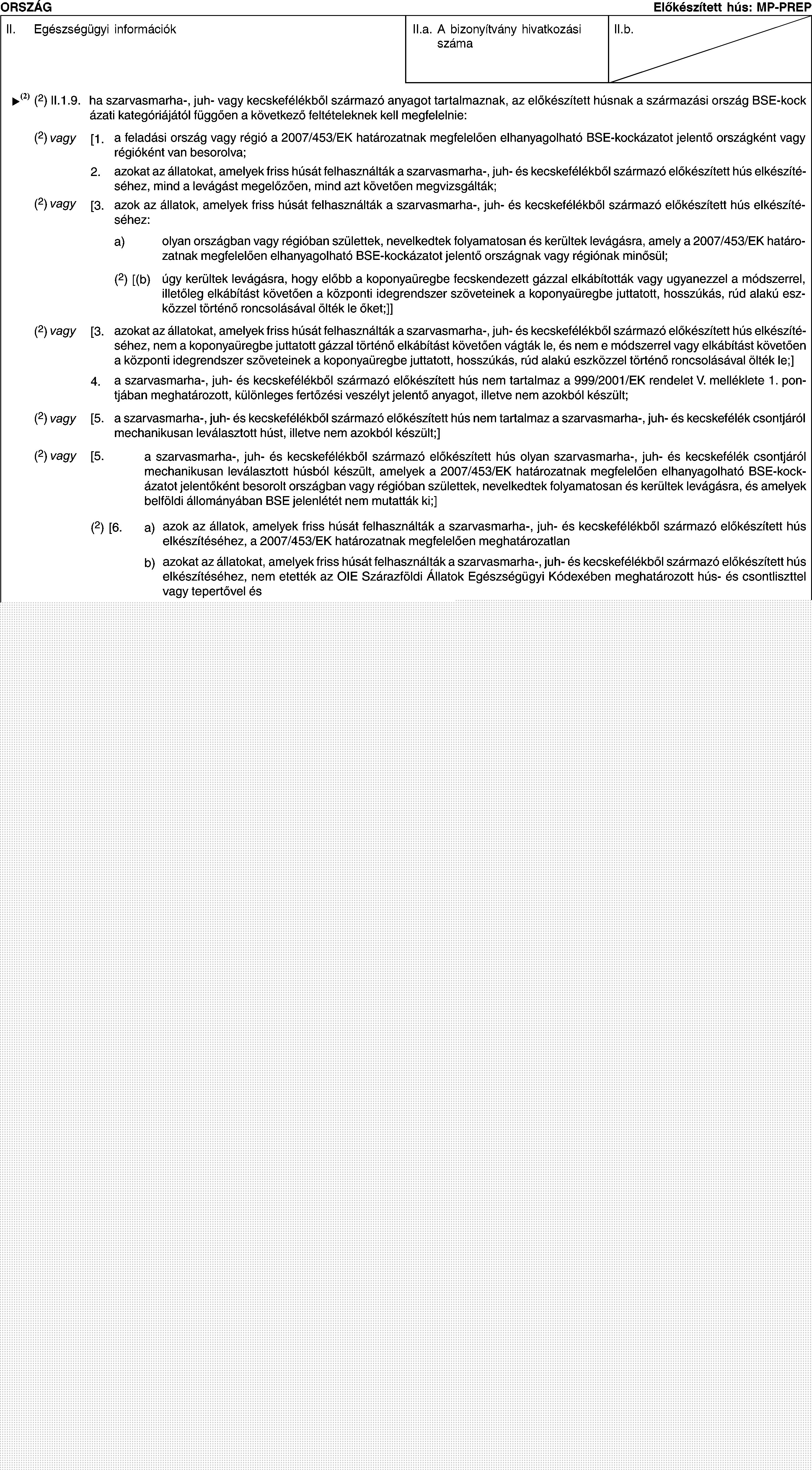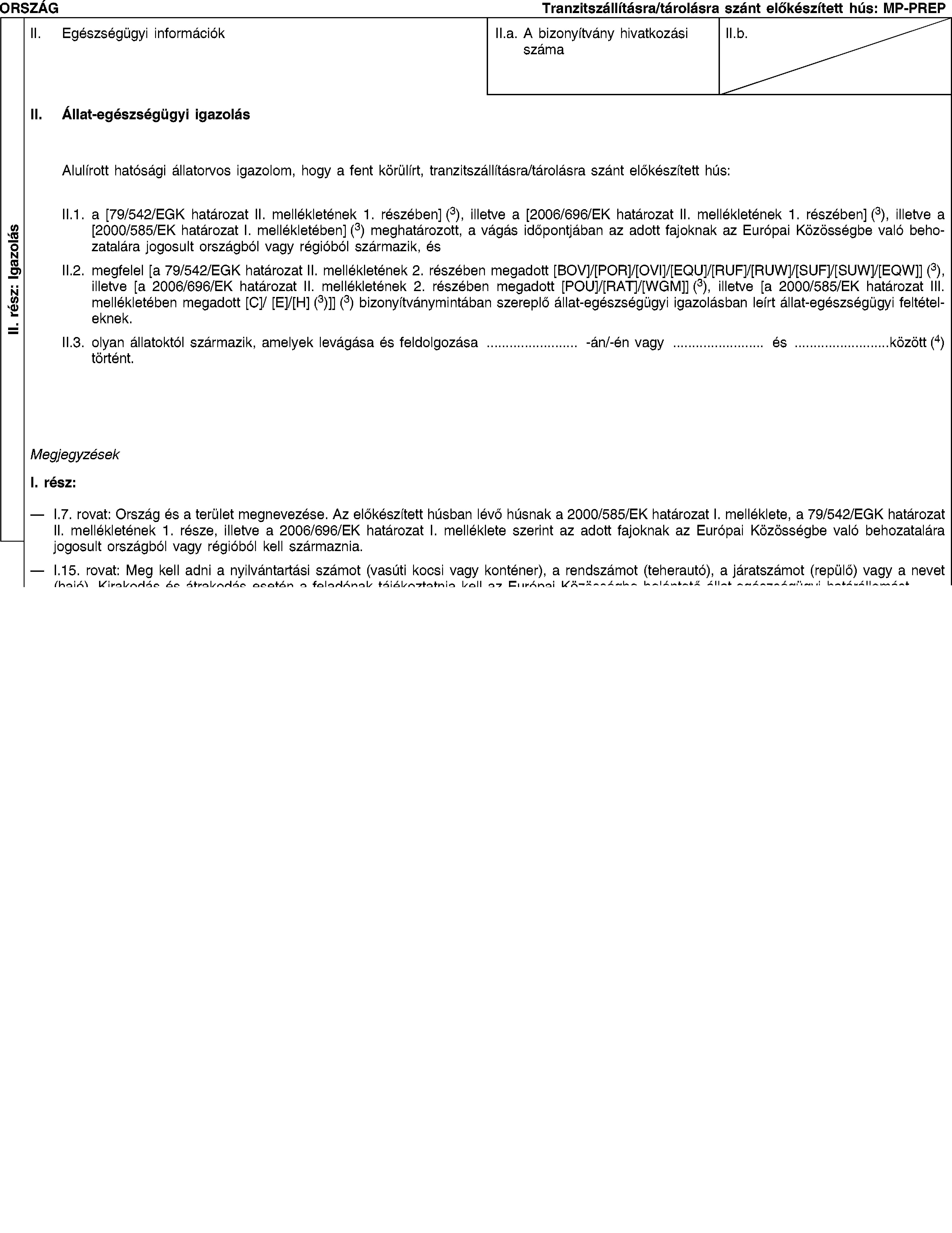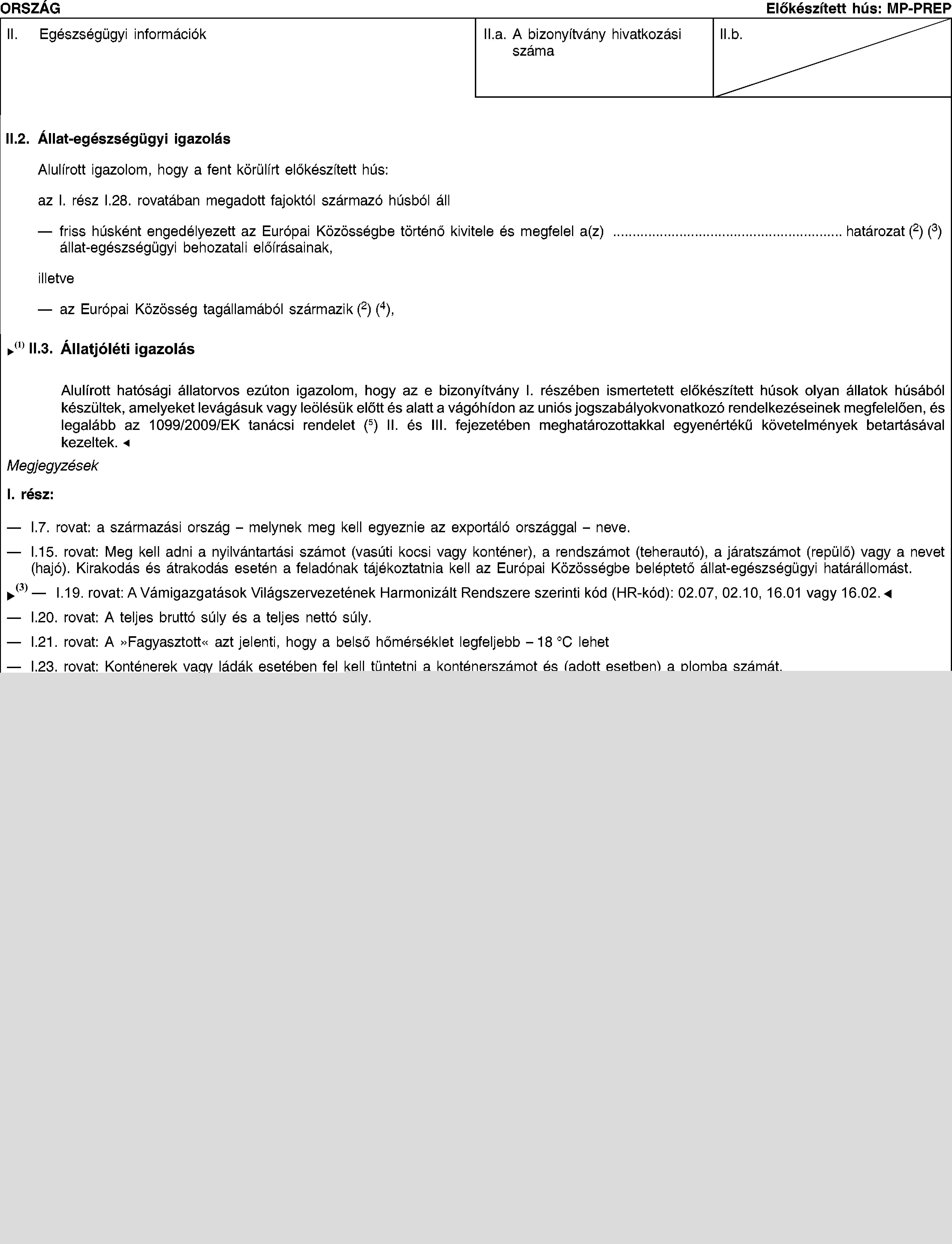 (2) Az előkészített húsok minden egyes szállítmányát egy eredeti és számozott egészségügyi bizonyítvány kísér, ami egyetlen kitöltött, aláírással és dátummal ellátott lapból áll, és amely megfelel a II. mellékletben meghatározott mintának.