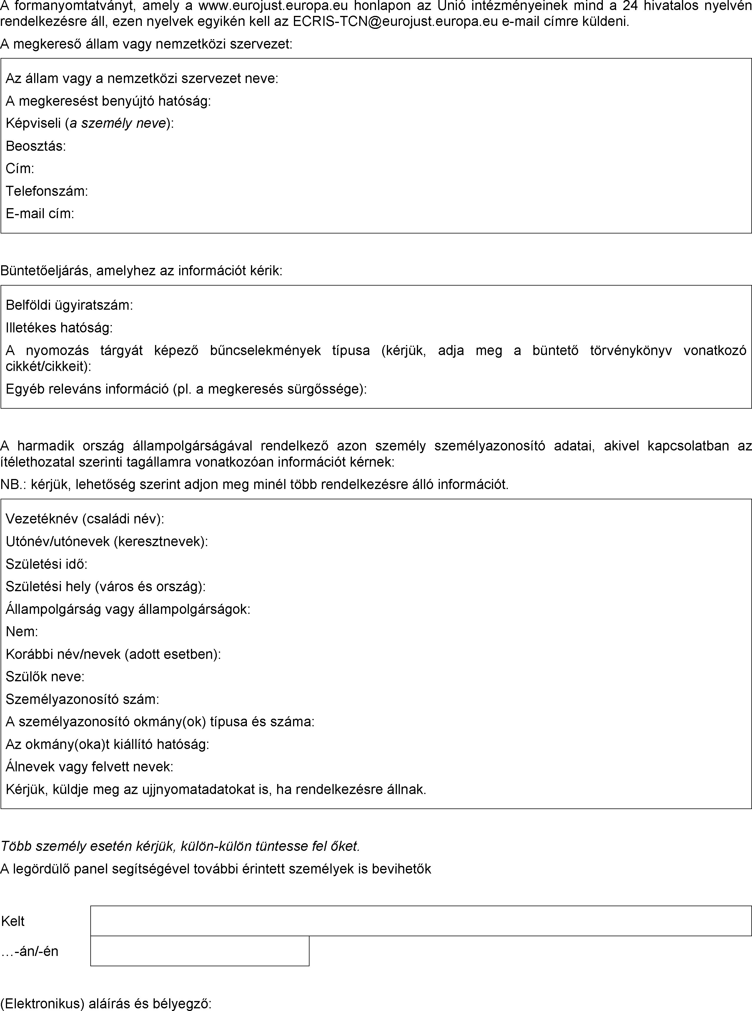 AZ (EU) 2019/816 RENDELET 17. CIKKÉNEK (1) BEKEZDÉSÉBEN EMLÍTETT EGYSÉGES FORMANYOMTATVÁNY INFORMÁCIÓ IRÁNTI MEGKERESÉSHEZ, ARRA IRÁNYULÓAN, HOGY - HA VANNAK ILYEN TAGÁLLAMOK - MELY TAGÁLLAMOK RENDELKEZNEK BŰNÜGYI NYILVÁNTARTÁSI INFORMÁCIÓKKAL AZ ÉRINTETT HARMADIK ORSZÁGBELI ÁLLAMPOLGÁRRA VONATKOZÓAN