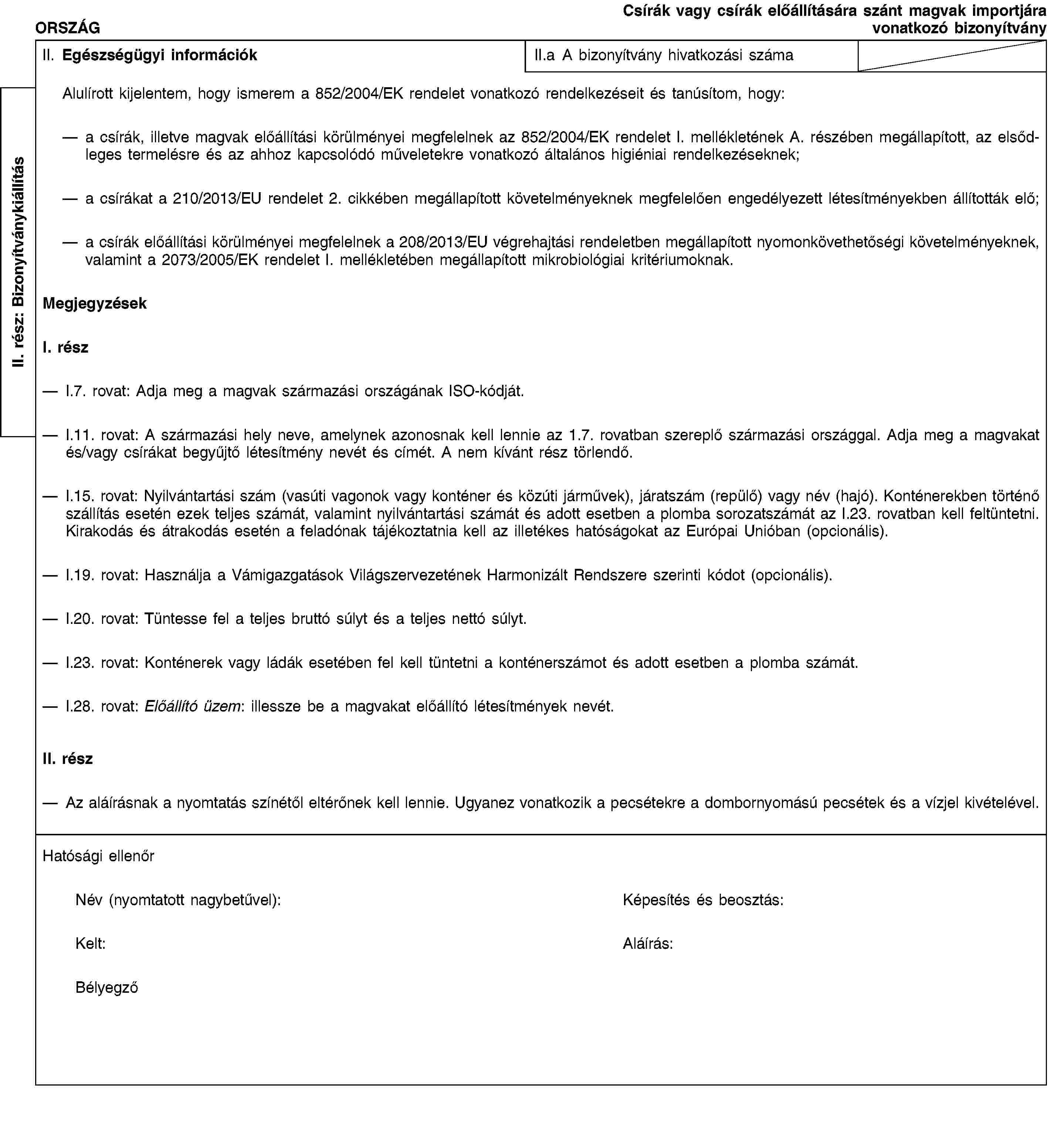 CSÍRÁK VAGY CSÍRÁK ELŐÁLLÍTÁSÁRA SZÁNT MAGVAK IMPORTJÁRA VONATKOZÓ BIZONYÍTVÁNYMINTA