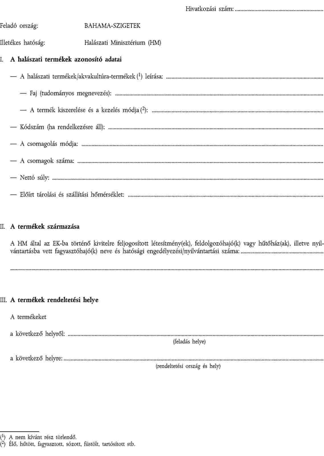 a Bahama-szigetekről származó és az Európai Közösségbe történő kivitelre szánt halászati termékekhez a kéthéjú kagylók, a tüskésbőrűek, a zsákállatok és a tengeri haslábúak bármely formája kivételével